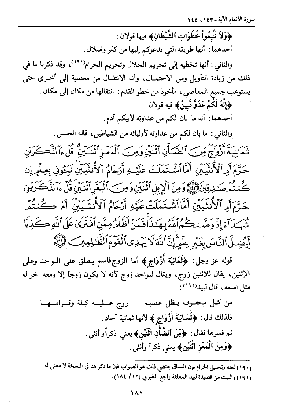{ثمانية أزواج من الضأن اثنين ومن المعز اثنين قل آلذكرين حرم أم الأنثيين أما اشتملت عليه أرحام الأنثيين نبئوني بعلم إن كنتم صادقين ومن الإبل اثنين ومن البقر اثنين قل آلذكرين حرم أم الأنثيين أما اشتملت عليه أرحام الأنثيين أم كنتم شهداء إذ وصاكم الله بهذا فمن أظلم ممن افترى على الله كذبا ليضل الناس بغير علم إن الله لا يهدي القوم الظالمين} قوله عز وجل: {ثَمَانِيَةَ أَزْوَاجٍ} أما الزوج فاسم ينطلق على الواحد وعلى الاثنين , يقال للاثنين زوج , ويقال للواحد زوج لأنه لا يكون زوجاً إلا ومعه آخر له مثل اسمه , قال لبيد: