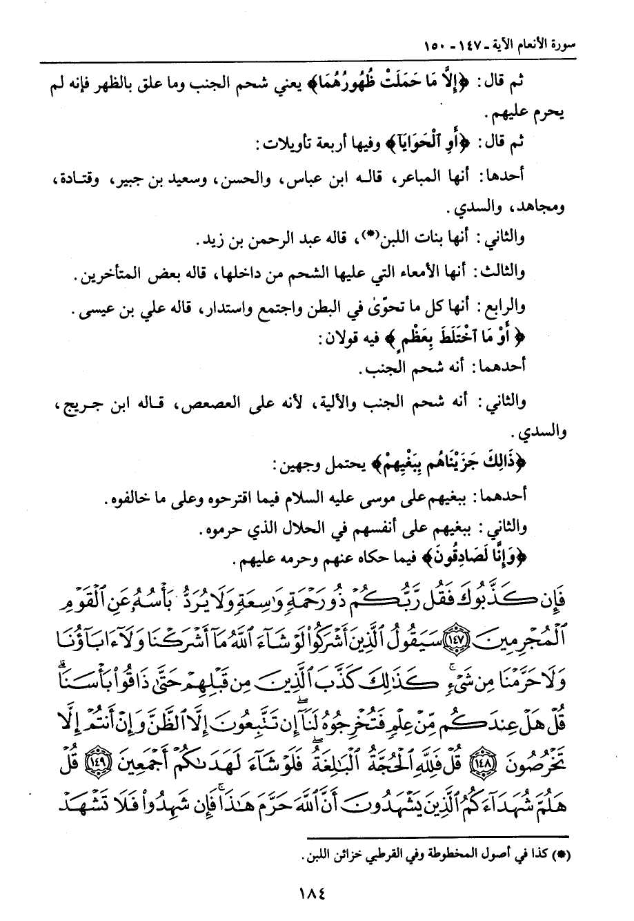 ثم قال: {إِلاَّ مَا حَمَلَتْ ظُهُورُهُمَا} يعني شحم الجنب وما علق بالظهر فإنه لم يحرم عليهم. ثم قال: {أَوْ الْحَوَايَآ} وفيها أربعة تأويلات: أحدها: أنها المباعر , قاله ابن عباس , والحسن , وسعيد بن جبير , وقتادة , ومجاهد , والسدي. والثاني: أنها بنات اللبن , قاله عبد الرحمن بن زيد. والثالث: أنها الأمعاء التي عليها الشحم من داخلها , قاله بعض المتأخرين. والرابع: أنها كل ما تحوّى في البطن واجتمع واستدار , قاله علي بن عيسى. {أَوْ مَا اخْتَلَطَ بِعَظْمٍ} فيه قولان: أحدهما: أنه شحم الجنب. والثاني: أنه شحم الجنب والأليه , لأنه على العصعص , قاله ابن جريج , والسدي. {ذَالِكَ جَزَيْنَاهُم ببَغْيِهِمْ} يحتمل وجهين: أحدهما: ببغيهم على موسى عليه السلام فيما اقترحوه وعلى ما خالفوه. والثاني: ببغيهم على أنفسهم في الحلال الذي حرموه. {وَإِنَّا لَصَادِقُونَ} فيما حكاه عنهم وحرمه عليهم.