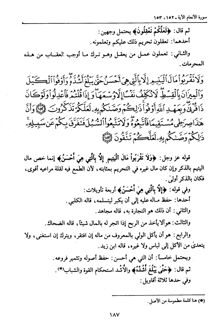 {ولا تقربوا مال اليتيم إلا بالتي هي أحسن حتى يبلغ أشده وأوفوا الكيل والميزان بالقسط لا نكلف نفسا إلا وسعها وإذا قلتم فاعدلوا ولو كان ذا قربى وبعهد الله أوفوا ذلكم وصاكم به لعلكم تذكرون وأن هذا صراطي مستقيما فاتبعوه ولا تتبعوا السبل فتفرق بكم عن سبيله ذلكم وصاكم به لعلكم تتقون} قوله عز وجل: {وَلاَ تَقْرَبُواْ مَالَ الْيَتِيمِ إِلاَّ بِالَّتِي هِيَ أَحْسَنُ} إنما خص مال اليتيم بالذكر وإن كان مال غيره في التحريم بمثابته , لأن الطمع فيه لقلة مراعيه أقوى , فكان بالذكر أولى. وفي قوله: {إِلاَّ بِالَّتِي هِيَ أَحْسَنُ} أربعة تأويلات: أحدها: حفظ ماله عليه إلى أن يكبر ليتسلمه , قاله الكلبي. والثاني: أن ذلك هو التجارة به , قاله مجاهد. والثالث: هو ألا يأخذ من الربح إذا اتجر له بالمال شيئاً , قاله الضحاك. والرابع: هو أن يأكل الولي بالمعروف من ماله إن افتقر , ويترك إن استغنى , ولا يتعدى من الأكل إلى الباس ولا غيره , قاله ابن زيد. ويحتمل خامساً: أن التي هي أحسن: حفظ أصوله وتثمير فروعه. ثم قال: {حَتَّى يَبْلُغَ أَشُدَّهُ} والأشُد القوة والشباب. وفي حدها ثلاثة أقاويل: