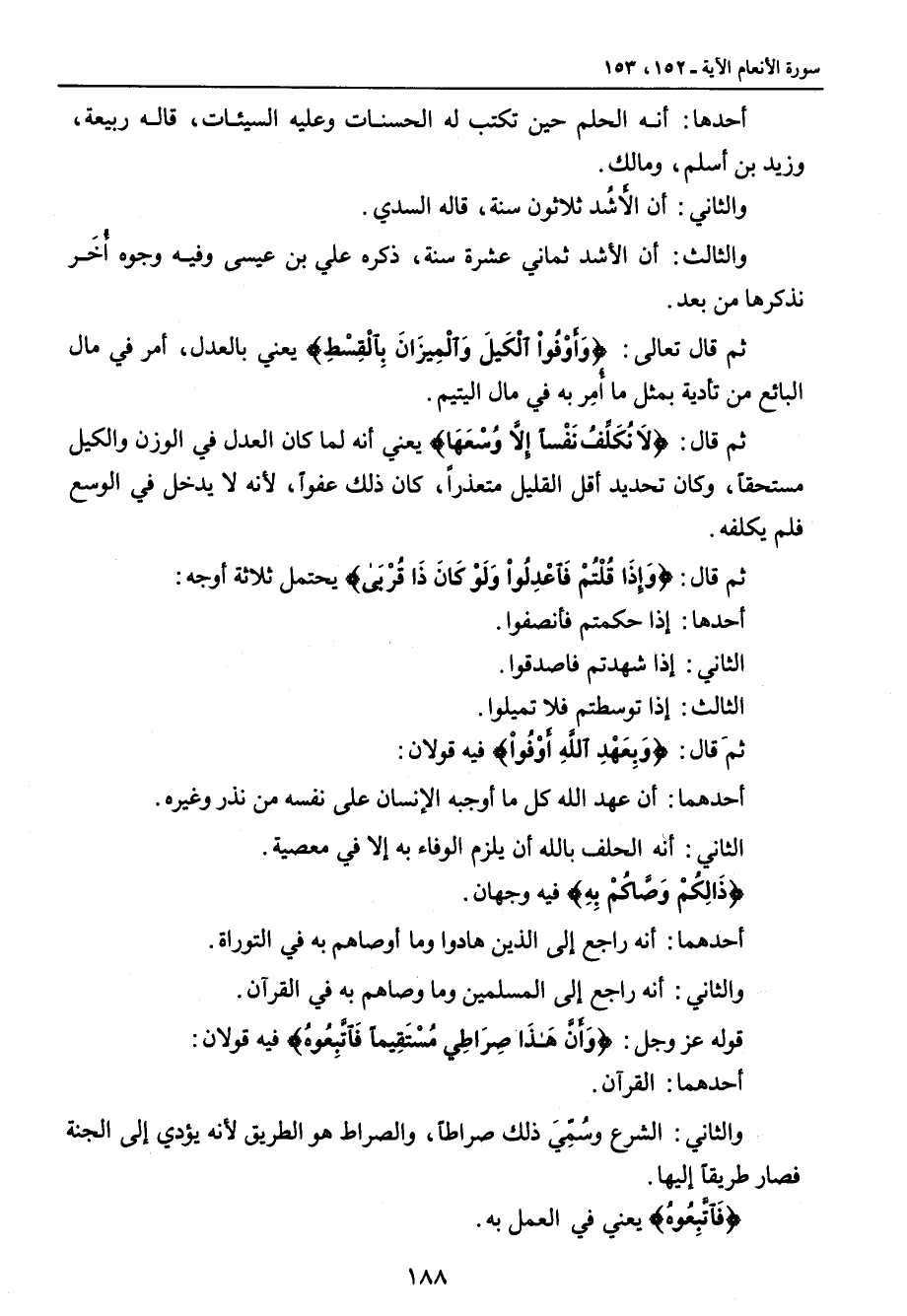 أحدها: أنه الحلم حين تكتب له الحسنات وعليه السيئات , قاله ربيعة , وزيد بن أسلم , ومالك. والثاني: أن الأَشُد ثلاثون سنة , قاله السدي. والثالث: أن الأشد ثماني عشرة سنة , ذكره علي بن عيسى وفيه وجوه أُخَر نذكرها من بعد. ثم قال تعالى: {وَأَوْفُواْ الْكَيلَ وَالْمِيزَانَ بِالْقِسْطِ} يعني بالعدل , أمر في مال البائع من تأدية بمثل ما أُمِر به في مال اليتيم. ثم قال: {لاَ نُكَلِّفُ نَفْساً إِلاَّ وُسْعَهَا} يعني أنه لما كان العدل في الوزن والكيل مستحقاً , وكان تحديد أقل القليل متعذراً , كان ذلك عفواً , لأنه لا يدخل في الوسع فلم يكلفه. ثم قال: {وَإِذَا قُلْتُمْ فَاعْدِلُواْ وَلَوْ كَانَ ذَا قُرْبَى} يحتمل ثلاثة أوجه: أحدها: إذا حكمتم فأنصفوا. الثاني: إذا شهدتم فاصدقوا. الثالث: إذا توسطتم فلا تميلوا. ثمَ قال: {وَبِعَهْدِ اللَّهِ أَوْفُواْ} فيه قولان: أحدهما: أن عهد الله كل ما أوجبه الإنسان على نفسه من نذر وغيره. الثاني: أنه الحلف بالله أن يلزم الوفاء به إلا في معصية. {ذَالِكُمْ وَصَّاكُمْ بِهِ} فيه وجهان: أحدهما: أنه راجع إلى الذين هادوا وما أوصاهم به في التوراة. والثاني: أنه راجع إلى المسلمين وما وصاهم به في القرآن. قوله عز وجل: {وََأَنَّ هَذَا صِرَاطِي مُسْتَقِيماً فَاتَّبِعُوهُ} فيه قولان: أحدهما: القرآن. والثاني: الشرع وسُمِّيَ ذلك صراطاً , والصراط هو الطريق لأنه يؤدي إلى الجنة فصار طريقاً إليها. {فَاتَّبِعُوهُ} يعني في العمل به.
