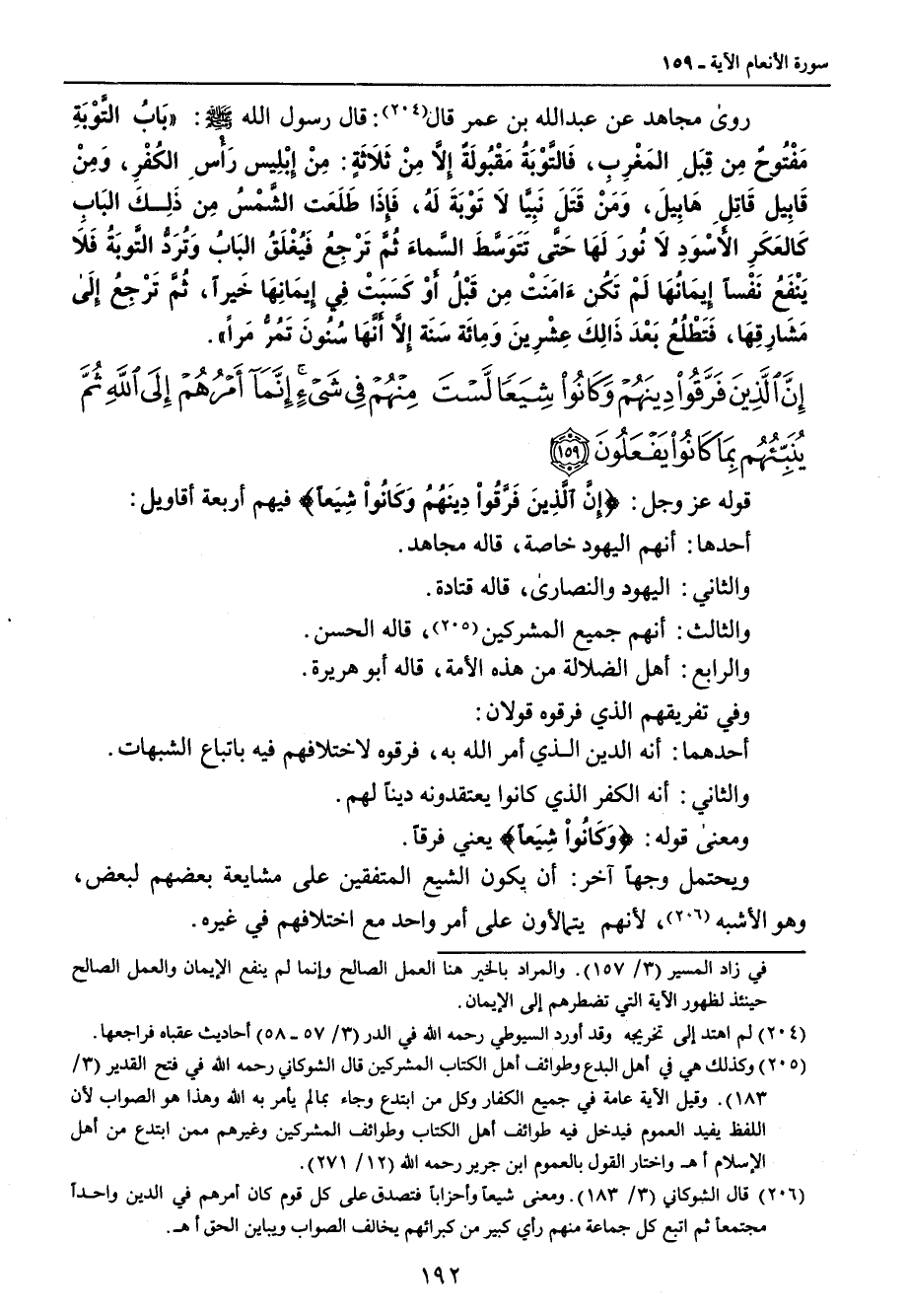 {إن الذين فرقوا دينهم وكانوا شيعا لست منهم في شيء إنما أمرهم إلى الله ثم ينبئهم بما كانوا يفعلون} قوله عز وجل: {إِنَّ الَّذِينَ فَرَّقُواْ دِينَهُمُ وَكَانُواْ شِيَعاً} فيهم أربعة أقاويل: أحدها: أنهم اليهود خاصة , قاله مجاهد. والثاني: اليهود والنصارى , قاله قتادة. والثالث: أنهم جميع المشركين , قاله الحسن. والرابع: أهل الضلالة من هذه الأمة , قاله أبو هريرة. وفي تفريقهم الذي فرقوه قولان: أحدهما: أنه الدين الذي أمر الله به , فرقوه لاختلافهم فيه باتباع الشبهات. والثاني: أنه الكفر الذي كانوا يعتقدونه ديناً لهم. ومعنى قوله: {وَكَانُواْ شيَعاً} يعني فرقاً. ويحتمل وجهاً آخر: أن يكون الشيع المتفقين على مشايعة بعضهم لبعض , وهو الأشبه , لأنهم يتمالأون على أمر واحد مع اختلافهم في غيره.