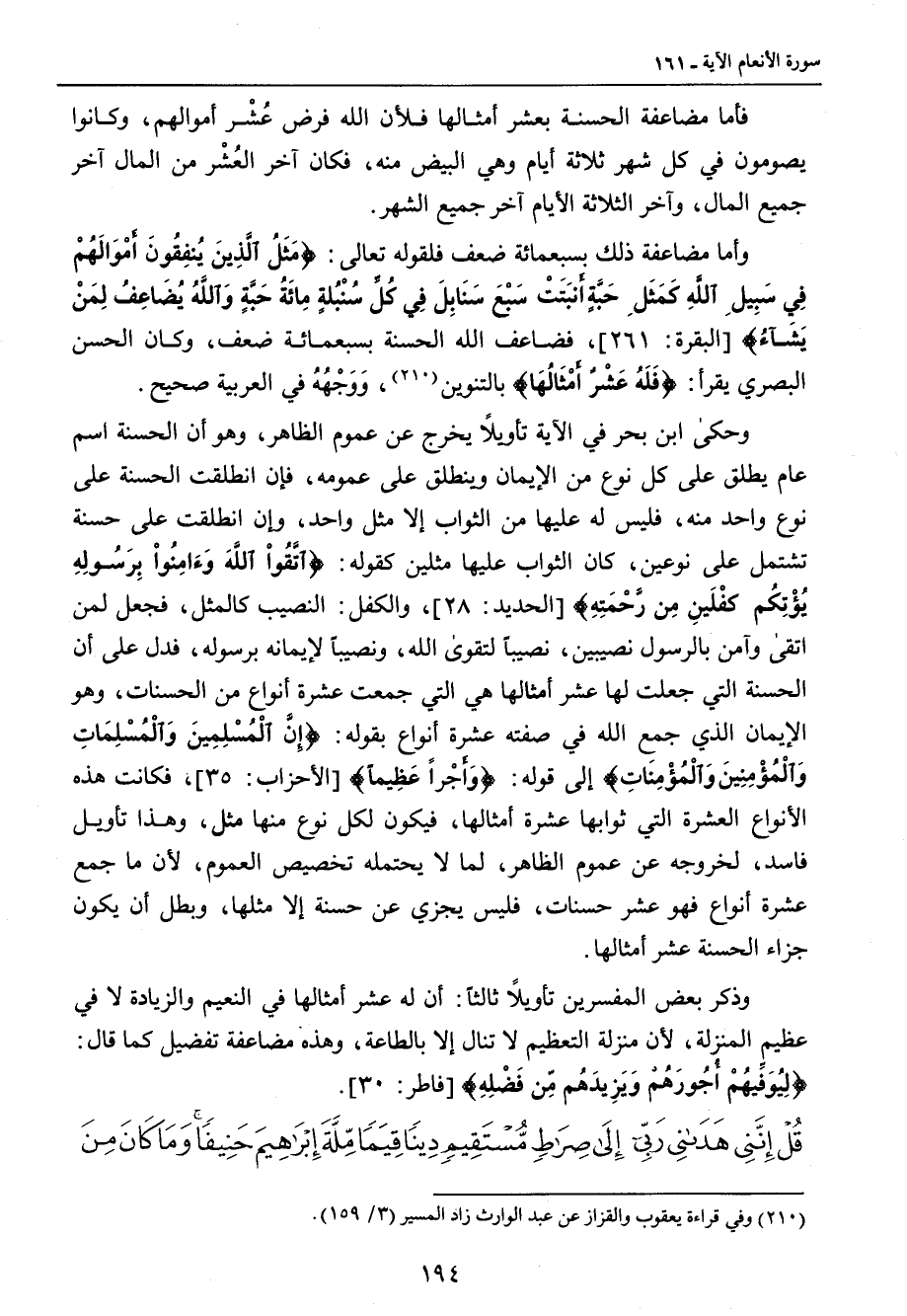 فأما مضاعفة الحسنة بعشر أمثالها فلأن الله فرض عُشْر أموالهم , وكانوا يصومون في كل شهر ثلاثة أيام وهي البيض منه , فكان آخر العُشْر من المال آخر جميع المال , وآخر الثلاثة الأيام آخر جميع الشهر. وأما مضاعفة ذلك بسبعمائة ضعف فلقوله تعالى: {مَثَلُ الَّذِينَ يُنفِقُونَ أَمْوَالَهُمْ فِي سَبِيلِ اللَّهِ كَمَثَلِ حَبَّةٍ أَنبَتَتْ سَبْعَ سَنَابِلَ فِي كُلِّ سُنْبُلِةٍ مِائَةُ حَبَّةٍ وَاللَّهُ يُضَاعِفُ لَمَنْ يَشَآءُ} [البقرة: 261] , فضاعف الله الحسنة بسبعمائة ضعف , وكان الحسن البصري يقرأ: {فَلَهُ عَشْرُ أَمْثَالُهَا} بالتنوين , وَوَجْهُهُ في العربية صحيح. وحكى ابن بحر في الآية تأويلاً يخرج عن عموم الظاهر , وهو أن الحسنة اسم عام يطلق على كل نوع من الإيمان وينطلق على عمومه , فإن انطلقت الحسنة على نوع واحد منه , فليس له عليها من الثواب إلا مثل واحد , وإن انطلقت على حسنة تشتمل على نوعين , كان الثواب عليها مثلين كقوله: {اتَّقُواْ اللَّهَ وَءَامِنُواْ بِرَسُولِهِ يُؤْتِكُم كفْلَيْنِ مِن رَّحْمَتِهِ} [الحديد: 28] , والكفل: النصيب كالمثل , فجعل لمن اتقى وآمن بالرسول نصيبين , نصيباً لتقوى الله , ونصيباً لإيمانه برسوله , فدل على أن الحسنة التي جعلت لها عشر أمثالها هي التي جمعت عشرة أنواع من الحسنات , وهو الإيمان الذي جمع الله في صفته عشرة أنواع بقوله: {إِنَّ الْمُسْلِمِينَ وَالْمُسْلِمَاتِ وَالْمُؤْمِنِينَ وَالْمُؤْمِنَاتِ} إلى قوله: {وَأَجْراً عَظِيماً} [الاحزاب: 35] , فكانت هذه الأنواع العشرة التي ثوابها عشرة أمثالها , فيكون لكل نوع منها مثل , وهذا تأويل فاسد , لخروجه عن عموم الظاهر , لما لا يحتمله تخصيص العموم , لأن ما جمع عشرة أنواع فهو عشر حسنات , فليس يجزي عن حسنة إلا مثلها , وبطل أن يكون جزاء الحسنة عشر أمثالها. وذكر بعض المفسرين تأويلاً ثالثاً: أن له عشر أمثالها في النعيم والزيادة لا في عظيم المنزلة , لأن منزلة التعظيم لا تنال إلا بالطاعة , وهذه مضاعفة تفضيل كما قال: {لِيُوَفِّيهُمْ أُجُورَهُمْ وَيَزِيدَهُم مِّن فَضْلِهِ} [فاطر: 30].