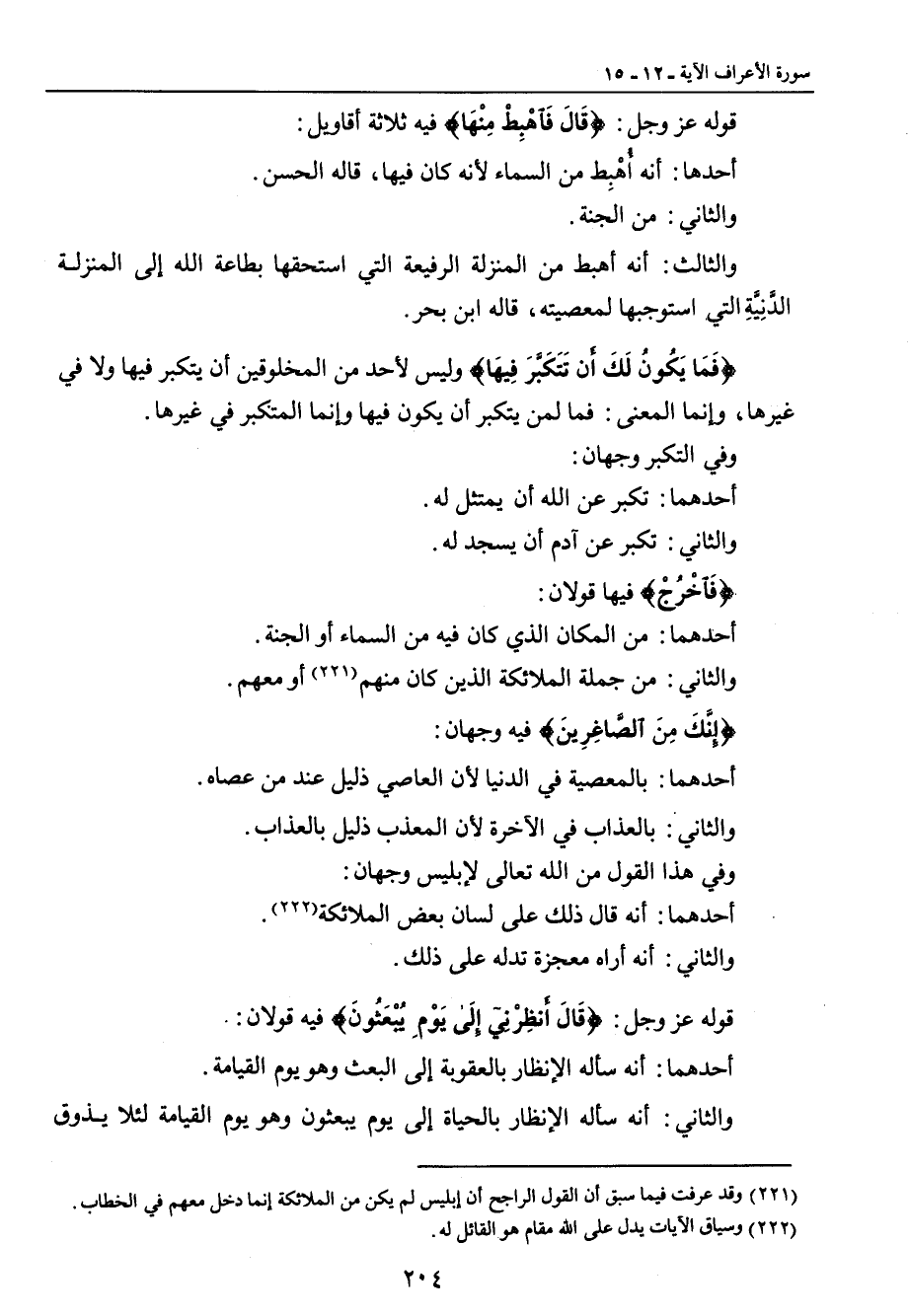 قوله عز وجل: {قَالَ فَاهْبِطْ مِنْهَا} فيه ثلاثة أقاويل: أحدهما: أنه أُهْبِط من السماء لأنه كان فيها , قاله الحسن. والثاني: من الجنة. والثالث: أنه أهبط من المنزلة الرفيعة التي استحقها بطاعة الله إلى المنزلة الدَّنِيَّةِ التي استوجبها لمعصيته , قاله ابن بحر. {فَمَا يَكُونُ لَكَ أَن تَتَكَبَّرَ فِيهَا} وليس لأحد من المخلوقين أن يتكبر فيها ولا في غيرها , وإنما المعنى: فما لمن يتكبر أن يكون فيها وإنما المتكبر في غيرها. وفي التكبر وجهان: أحدهما: تكبر عن الله أن يمتثل له. والثاني: تكبر عن آدم أن يسجد له. {فَاخْرُجْ} فيها قولان: أحدهما: من المكان الذي كان فيه من السماء أو الجنة. والثاني: من جملة الملائكة الذين كان منهم أو معهم. {إِنَّكَ مِنَ الصَّاغِرِينَ} فيه وجهان: أحدهما: بالمعصية في الدنيا لأن العاصي ذليل عند من عصاه. والثاني: بالعذاب في الآخرة لأن المعذب ذليل بالعذاب. وفي هذا القول من الله تعالى لإبليس وجهان: أحدهما: أنه قال ذلك على لسان بعض الملائكة. والثاني: أنه أراه معجزة تدله على ذلك. قوله عز وجل: {قَالَ أَنظِرْنِي إِلَى يَوْمِ يُبْعَثُونَ} فيه قولان: أحدهما: أنه سأله الإنظار بالعقوبة إلى البعث وهو يوم القيامة. والثاني: أنه سأله الإنظار بالحياة إلى يوم يبعثون وهو يوم القيامة لئلا يذوق