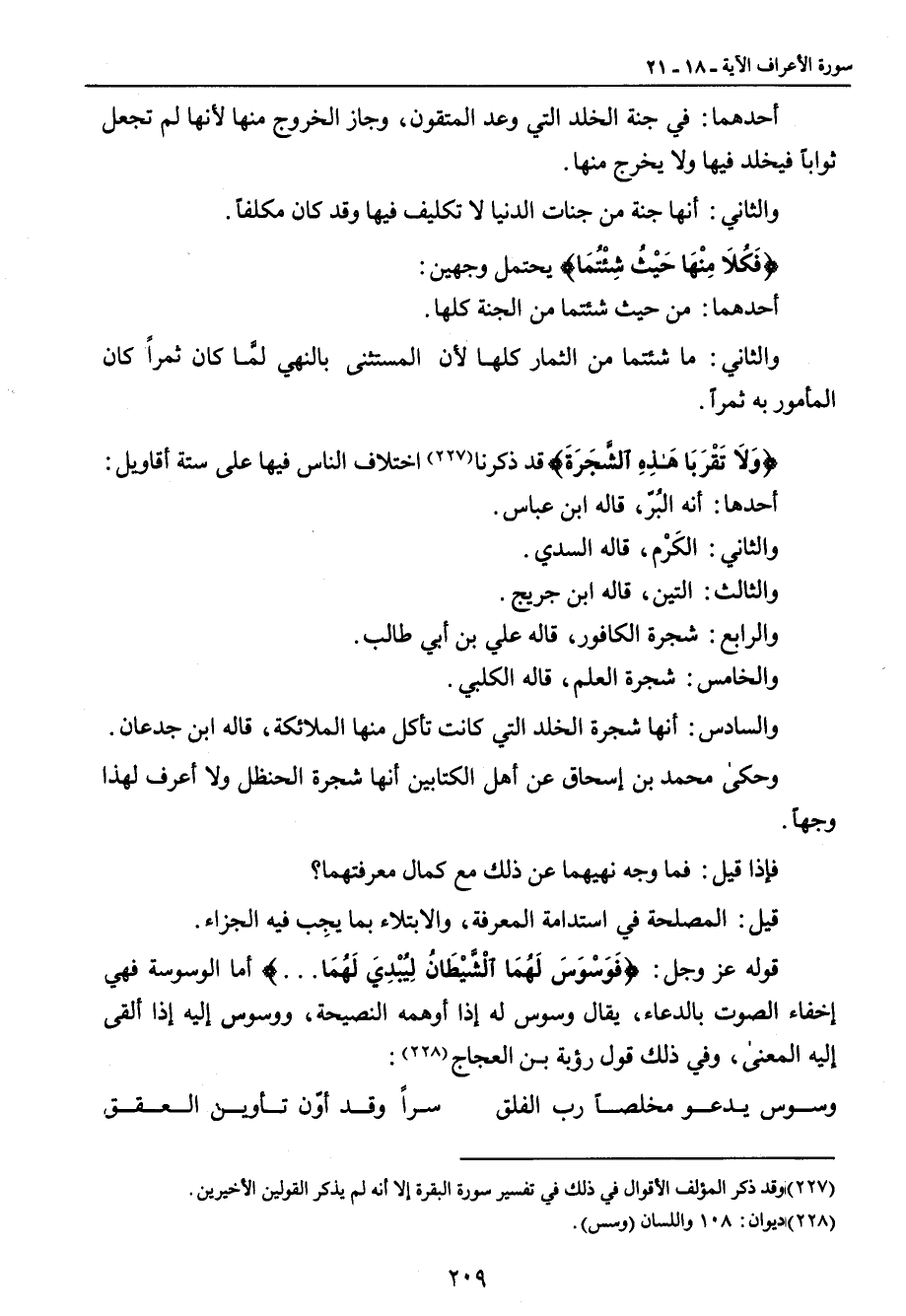 أحدهما: في جنة الخلد التي وعد المتقون , وجاز الخروج منها لأنها لم تجعل ثواباً فيخلد فيها ولا يخرج منها. والثاني: أنها جنة من جنات الدنيا لا تكليف فيها وقد كان مكلفاً. {فَكُلاَ مِنْهَا حَيْثُ شِئْتَمُا} يحتمل وجهين: أحدهما: من حيث شئتما من الجنة كلها. والثاني: ما شئتما من الثمار كلها لأن المستثنى بالنهي لمَّا كان ثمراً كان المأمور به ثمراً. {وَلاَ تَقَْرَبَا هَذِهِ الشَّجَرَةَ} قد ذكرنا اختلاف الناس فيها على ستة أقاويل: أحدها: أنه البُرّ , قاله ابن عباس. والثاني: الكَرْم , قاله السدي. والثالث: التين , قاله بان جريج. والرابع: شجرة الكافور , قاله علي بن أبي طالب. والخامس: شجرة العلم , قاله الكلبي. والسادس: أنها شجرة الخلد التي كانت تأكل منها الملائكة , قاله ابن جدعان , وحكى محمد بن إسحاق عن أهل الكتابين أنها شجرة الحنظل ولا أعرف لهذا وجهاً. فإذا قيل: فما وجه نهيهما عن ذلك مع كمال معرفتهما؟ قيل: المصلحة في استدامة , المعرفة , والابتلاء بما يجِب فيه الجزاء. قوله عز وجل: {فَوَسْوَسَ لَهُمَا الْشَّيْطَانُ لِيُبْدِيَ لَهُمَا ... } أما الوسوسة فهي إخفاء الصوت بالدعاء , يقال وسوس له إذا أوهمه النصيحة , ووسوس إليه إذا ألقى إليه المعنى , وفي ذلك قول رؤبة بن العجاج:
