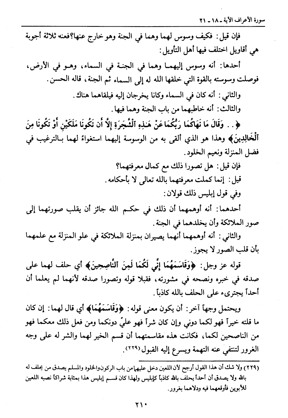 فإن قيل: فكيف وسوس لهما وهما في الجنة وهو خارج عنها؟ فعنه ثلاثة أجوبة هي أقاويل اختلف فيها أهل التأويل: أحدها: أنه وسوس إليها وهما في الجنة في السماء , وهو في الأرض , فوصلت وسوسته بالقوة التي خلقها الله له إلى السماء ثم الجنة , قاله الحسن. والثاني: أنه كان في السماء وكانا يخرجان إليه فيلقاهما هناك. والثالث: أنه خاطبهما من باب الجنة وهما فيها. { ... وَقَالَ مَا نَهَاكُمَا رَبُّكُمَا عَنْ هَذِهِ الْشَّجَرَةِ إِلاَّ أَن تَكُونَا مَلَكَيْنِ أَوْ تَكُونَا مِنَ الْخَالِدِينَ} وهذا هو الذي ألقى به من الوسوسة إليهما استغواءً لهما بالترغيب في فضل المنزلة ونعيم الخلود. فإن قيل: هل تصورا ذلك مع كمال معرفتهما؟ قيل: إنما كملت معرفتهما بالله تعالى لا بأحكامه. وفي قول إبليس ذلك قولان: أحدهما: أنه أوهمهما أن ذلك في حكم الله جائز أن يقلب صورتهما إلى صور الملائكة وأن يخلدهما في الجنة. والثاني: أنه أوهمهما أنهما يصيران بمنزلة الملائكة في علو المنزلة مع علمهما بأن قلب الصور لا يجوز. قوله عز وجل: {وَقَاسَمَهُمَا إِنِّي لَكُمَا لَمِنَ النَّاصِحِينَ} أي حلق لهما على صدقه في خبره ونصحه في مشورته , فقبلا قوله وتصورا صدقه لأنهما لم يعلما أن أحداً يجترىء على الحلف بالله كاذباً. ويحتمل وجهاً آخر: أن يكون معنى قوله: {وَقَاسَمَهُمَا} أي قال لهما: إن كان ما قلته خيراً فهو لكما دوني وإن كان شراً فهو عليّ دونكما ومن فعل ذلك معكما فهو من الناصحين لكما , فكانت هذه مقاسمتهما أن قسم الخير لهما والشر له على وجه الغرور لتنتفي عنه التهمة ويسرع إليه القبول.