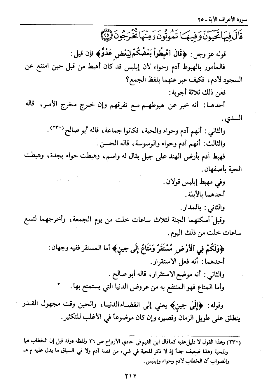قال فيها تحيون وفيها تموتون ومنها تخرجون} قوله عز وجل: {قَالَ اهْبِطُواْ بَعْضُكُمْ لِبَعْضٍ عَدُوٌّ} فإن قيل: فالمأمور بالهبوط آدم وحواء لأن إبليس قد كان أهبط من قبل حين امتنع عن السجود لآدم , فكيف عبر عنهما بلفظ الجمع؟ فعن ذلك ثلاثة أجوبة: أحدها: أنه خبر عن هبوطهم مع تفرقهم وإن خرج مخرج الأمر , قاله السدي. والثاني: أنهم آدم وحواء والحية , فكانوا جماعة , قاله أبو صالح. والثالث: أنهم آدم وحواء والوسوسة , قاله الحسن. فهبط آدم بأرض الهند على جبل يقال له واسم , وهبطت حواء بجدة , وهبطت الحية بأصفهان. وفي مهبط إبليس قولان. أحدهما بالأبلة. والثاني: بالمدار. وقيل أسكنهما الجنة لئلا ساعات خلت من يوم الجمعة , وأخرجهما لتسع ساعات خلت من ذلك اليوم. {وَلَكُمْ فِي الأَرْضِ مُسْتَقَرٌ وَمَتَاعٌ إِلَى حِينٍ} أما المستقر ففيه وجهان: أحدهما: أنه فعل الاستقرار. والثاني: أنه موضع الاستقرار , قاله أبو صالح. وأما المتاع فهو المنتفع به من عروض الدنيا التي يستمتع بها. وقوله: {إِلَى حِينٍ} يعني إلى انقضاء الدنيا , والحين وقت مجهول القدر ينطلق على طويل الزمان وقصيره وإن كان موضوعاً في الأغلب للتكثير.