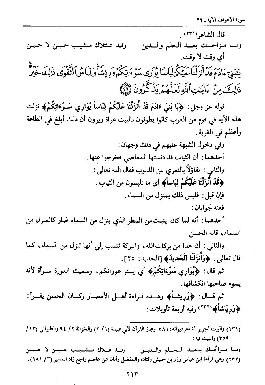 {يا بني آدم قد أنزلنا عليكم لباسا يواري سوآتكم وريشا ولباس التقوى ذلك خير ذلك من آيات الله لعلهم يذكرون} قوله عز وجل: {يَا بَنِيَءَادَمَ قَدْ أَنزَلْنَا عَلَيْكُمْ لِبَاساً يُوَارِي سَوُءَاتِكُمْ} نزلت هذه الآية في قوم من العرب كانوا يطوفون بالبيت عراة ويرون أن ذلك أبلغ في الطاعة وأعظم في القربة. وفي دخول الشبهة عليهم في ذلك وجهان: أحدهما: أن الثياب قد دنستها المعاصي فخرجوا عنها. والثاني: تفاؤلاً بالتعري من الذنوب فقال الله تعالى: {قَدْ أَنزَلْنَا عَلَيْكُمْ لِبَاساً} أي ما تلبسون من الثياب. فإن قيل: فليس ذلك بمنزل من السماء. فعنه جوابان: أحدهما: أنه لما كان ينبت من المطر الذي نزل من السماء صار كالمنزل من السماء , قاله الحسن. والثاني: أن هذا من بركات الله , والبركة تنسب إلى أنها تنزل من السماء , كما قال تعالى: {وَأَنزَلْنَا الْحَدِيدَ} [الحديد: 25]. ثم قال: {يُوَارِي سَوْءَاتِكُمْ} أي يستر عوراتكم , وسميت العورة سوأة لأنه يسوء صاحبها انكشافها. ثم قال: {وَرِيشاً} وهذه قراءة أهل الأمصار وكان الحسن يقرأ: {وَرِيَاشاً} وفيه أربعة تأويلات:
