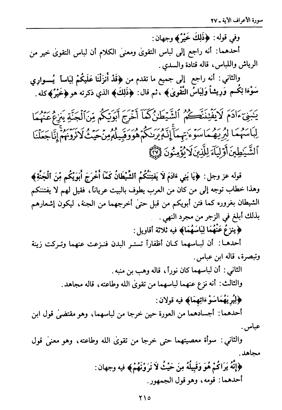 {يا بني آدم لا يفتننكم الشيطان كما أخرج أبويكم من الجنة ينزع عنهما لباسهما ليريهما سوآتهما إنه يراكم هو وقبيله من حيث لا ترونهم إنا جعلنا الشياطين أولياء للذين لا يؤمنون} قوله عز وجل: {يَا بَنِيءَادَمَ لاَ يَفتِنَنَّكُمْ الشَّيْطَانُ كَمَا أَخْرَجَ أَبَوَيْكُم مِّنَ الْجَنَّةِ} وهذا خطاب توجه إلى من كان من العرب يطوف بالبيت عرياناً , فقيل لهم لا يفتننكم الشيطان بغروره كما فتن أبويكم من قبل حتى أخرجهما من الجنة , ليكون إِشعارهم بذلك أبلغ في الزجر من مجرد النهي. {ينزعُ عَنْهُمَا لِبَاسَهُمَا} فيه ثلاثة أقاويل: أحدها: أن لباسهما كان أظفاراً تستر البدن فنزعت عنهما وتركت زينة وتبصرة , قاله ابن عباس. الثاني: أن لباسهما كان نوراً , قاله وهب بن منبه. والثالث: أن نزع عنهما لباسهما من تقوى الله وطاعته , قاله مجاهد. {لِيُرِيَهُمَا سَوْءَاتِهِمَا} فيه قولان: أحدهما: أجسادهما من العورة حين خرجا من لباسهما , وهو مقتضى قول ابن عباس. والثاني: سوأة معصيتهما حتى خرجا من تقوى الله وطاعته , وهو معنى قول مجاهد. {إِنَّهُ يَرَاكُمْ هُوَ وَقَبِيلُهُ مِنَ حَيْثُ لاَ تَرَوْنَهُمْ} فيه وجهان: أحدهما: قومه , وهو قول الجمهور.