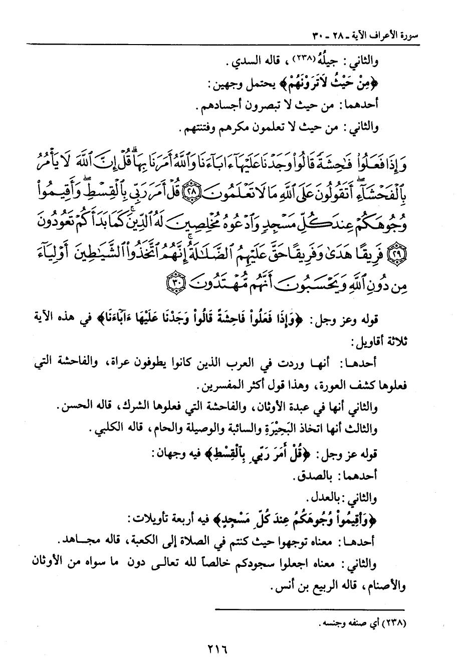 {وإذا فعلوا فاحشة قالوا وجدنا عليها آباءنا والله أمرنا بها قل إن الله لا يأمر بالفحشاء أتقولون على الله ما لا تعلمون قل أمر ربي بالقسط وأقيموا وجوهكم عند كل مسجد وادعوه مخلصين له الدين كما بدأكم تعودون فريقا هدى وفريقا حق عليهم الضلالة إنهم اتخذوا الشياطين أولياء من دون الله ويحسبون أنهم مهتدون} قوله عز وجل: {وَإِذَا فَعَلُواْ فَاحِشَةً قَالُواْ وَجَدْنَا عَلَيْهَاءَابَآءَنَا} في هذه الآية ثلاثة أقاويل: أحدها: أنها وردت في العرب الذين كانوا يطوفون عراة , والفاحشة التي فعلوها كشف العورة , وهذا قول أكثر المفسرين. والثاني أنها في عبدة الأوثان , والفاحشة التي فعلوها الشرك , قاله الحسن. والثالث أنها اتخاذ البَحِيْرَةِ والسائبة والوصيلة والحام , قاله الكلبي. قوله عز وجل: {قُلْ أَمَرَ رَبِّي بِالْقِسْطِ} فيه وجهان: أحدهما: بالصدق. والثاني: بالعدل. {وَأقِيمُواْ وُجُوهَكُمْ عِندَ كُلِّ مَسْجِدٍ} فيه أربعة تأويلات: أحدها: معناه توجهوا حيث كنتم في الصلاة إلى الكعبة , قاله مجاهد. والثاني: معناه اجعلوا سجودكم خالصاً لله تعالى دون ما سواه من الأوثان والأصنام , قاله الربيع بن أنس.