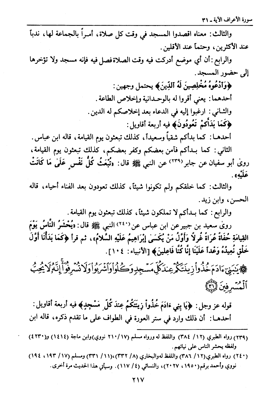 والثالث: معناه اقصدوا المسجد في وقت كل صلاة , أمراً بالجماعة لها , ندباً عند الأكثرين , وحتماً عن الأقلين. والرابع: أن أي موضع أدركت فيه وقت الصلاة فصل فيه فإنه مسجد ولا تؤخرها إلى حضور المسجد. {وَاْعُوهُ مُخْلِصِينَ لَهُ الدِّينَ} يحتمل وجهين: أحدهما: يعني أقروا له بالوحدانية وإخلاص الطاعة. والثاني: ارغبوا إليه في الدعاء بعد إخلاصكم له الدين. {كَمَا بَدَأَكُمْ تَعُودُونَ} فيه أربعة أقاويل: أحدها: كما بدأكم شقياً وسعيداً , كذلك تبعثون يوم القيامة , قاله ابن عباس. الثاني: كما بدأكم فآمن بعضكم وكفر بعضكم , كذلك تبعثون يوم القيامة. روى أبو سفيان عن جابر عن النبي صلى الله عليه وسلم قال: (تُبْعَثُ كُلُّ نَفْسٍ عَلَى مَا كَانَتْ عَلَيْهِ). والثالث: كما خلقكم ولم تكونوا شيئاً , كذلك تعودون بعد الفناء أحياء , قاله الحسن , وابن زيد. والرابع: كما بدأكم لا تملكون شيئاً , كذلك تبعثون يوم القيامة. روى سعيد بن جبير عن ابن عباس عن النبي صلى الله عليه وسلم قال: (يُحْشَرُ النَّاسُ يَوْمَ القِيامَةِ حُفَاةً عُرَاةً غُرلاً وَأَوَّلُ مَنْ يُكَسَى إِبْرَاهِيمُ عَلَيهِ السَّلاَمُ) ثم قرأ {كَمَا بَدَأْنَا أَوَّلَ خَلْقٍ نُعِيدُهُ وَعْداً عَلَيْنَا إِنَّا كُنَّا فَاعِلينَ} [الأنبياء: 104].