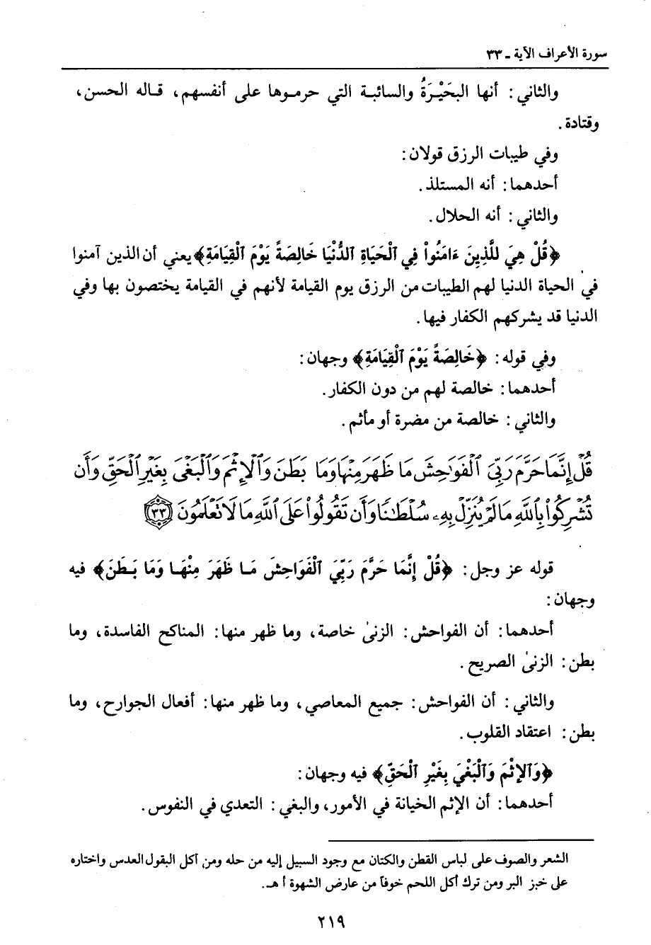 {قل إنما حرم ربي الفواحش ما ظهر منها وما بطن والإثم والبغي بغير الحق وأن تشركوا بالله ما لم ينزل به سلطانا وأن تقولوا على الله ما لا تعلمون} قوله عز وجل: {قُلْ إِنَّمَا حَرَّمَ رَبِّيَ الْفَوَاحِشَ مَا ظَهَرَ مِنْهَا وَمَا بَطَنَ} فيه وجهان: أحدهما: أن الفواحش: الزنى خاصة , وما ظهر منها: المناكح الفاسدة , وما بطن: الزنى الصريح. والثاني: أن الفواحش: جميع المعاصي , وما ظهر منها: أفعال الجوارح , وما بطن: اعتقاد القلوب. {وَالإِثْمَ وَالْبَغْيَ بِغَيْرِ الْحَقِّ} فيه وجهان: أحدهما: أن الإثم الخيانة في الأمور , والبغي: التعدي في النفوس.