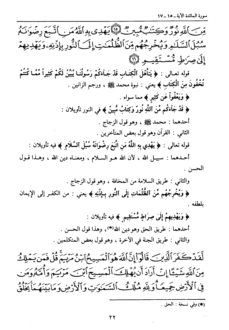 من الله نور وكتاب مبين يهدي به الله من اتبع رضوانه سبل السلام ويخرجهم من الظلمات إلى النور بإذنه ويهديهم إلى صراط مستقيم} قوله تعالى: {يَأَهْلَ الْكِتَابِ قَدْ جَآءَكُمْ رَسُولُنَا يُبَيِّنُ لَكُمْ كَثِيراً مِّمَّا كُنْتُمْ تُخْفُونَ مِنَ الْكِتَابِ} يعني: نبوة محمد صلى الله عليه وسلم , ورجم الزانين. {وَيَعْفُواْ عَن كَثِيرٍ} مما سواه. {قَدْ جَآءَكم مِّنَ اللَّهِ نُورٌ وَكِتَابٌ مُّبِينٌ} فى النور تأويلان: أحدهما: محمد صلى الله عليه وسلم , وهو قول الزجاج. الثاني: القرآن وهو قول بعض المتأخرين. قوله تعالى: {يَهْدِي بِهِ اللَّهُ مَنِ اتَّبِعَ رِضْوَانَهُ سُبُلَ السَّلاَمِ} فيه تأويلان: أحدهما: سبيل الله , لأن الله هو السلام , ومعناه دين الله , وهذا قول الحسن. والثاني: طريق السلامة من المخافة , وهو قول الزجاج. {وَيُخْرِجُهُم مِّنَ الظُّلُمَاتِ إِلَى النُّورِ بِإِذْنِهِ} يعني: من الكفر إلى الإِيمان بلطفه. {وَيَهْدِيهِمْ إِلَى صِرَاطٍ مُّسْتَقِيمٍ} فيه تأويلان: أحدهما: طريق الحق وهو دين الله , وهذا قول الحسن. والثاني: طريق الجنة فى الآخرة , وهو قول بعض المتكلمين.