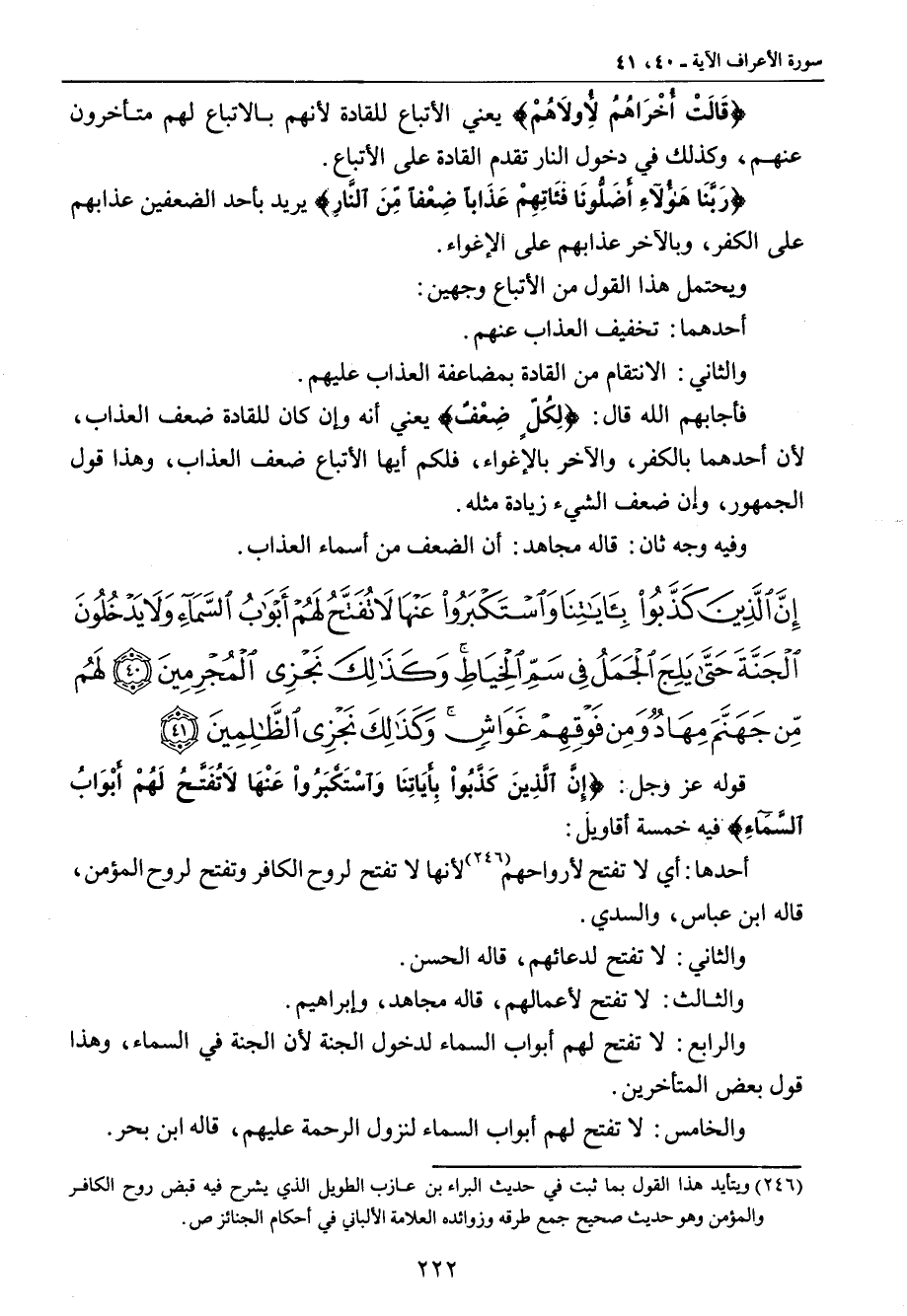 {إن الذين كذبوا بآياتنا واستكبروا عنها لا تفتح لهم أبواب السماء ولا يدخلون الجنة حتى يلج الجمل في سم الخياط وكذلك نجزي المجرمين لهم من جهنم مهاد ومن فوقهم غواش وكذلك نجزي الظالمين} قوله عز وجل: {إِنَّ الَّذِينَ كَذَّبُواْ بئَايَاتِنَا وَاسْتَكْبَرُواْ عَنْهَا لاَ تُفَتَّحُ لَهُمْ أَبْوَابُ السَّمَآءِ} فيه خمسة أقاويل: أحدها: أي لا تفتح لأرواحهم لأنها تفتح لروح الكافر وتفتح لروح المؤمن , قاله ابن عباس , والسدي. والثاني: لا تفتح لدعائهم , قاله الحسن. والثالث: لا تفتح لأعمالهم , قاله مجاهد , وإبراهيم. والرابع: لا تفتح لهم أبواب السماء لدخول الجنة لأن الجنة في السماء , وهذا قول بعض المتاخرين. والخامس: لا تفتح لهم أبواب السماء لنزول الرحمة عليهم , قاله ابن بحر.