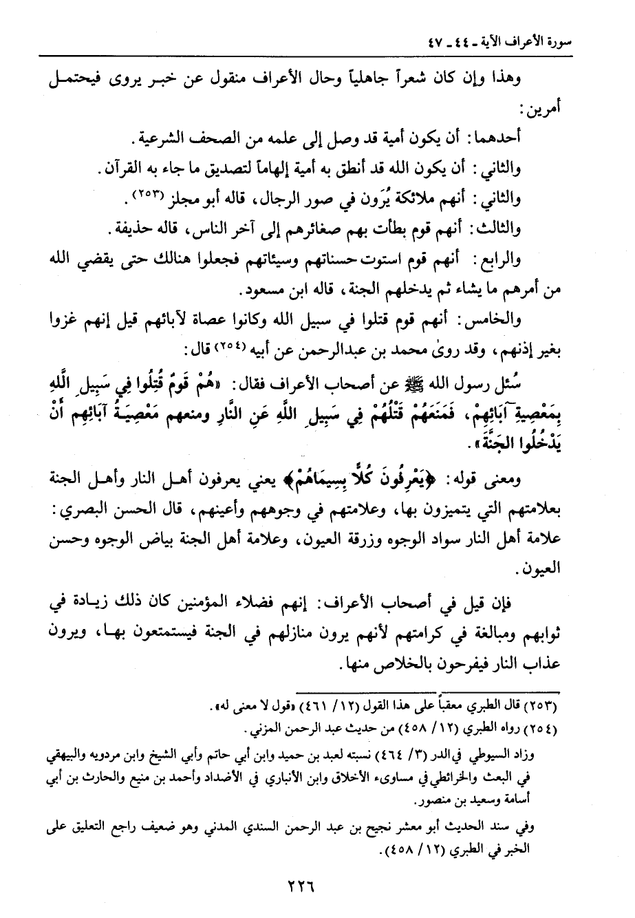 وهذا وإن كان شعراً جاهلياً وحال الأعراف منقول عن خبر يروى فيحتمل أمرين: أحدهما: أن يكون أمية قد وصل إلى علمه من الصحف الشرعية. والثاني: أن يكون الله قد انطق به أمية إلهاماً لتصديق ما جاء به القرآن. والثاني: أنهم ملائكة يُرَون في صور الرجال , قاله أبو مجلز. والثالث: أنهم قوم بطأت بهم صغائرهم إلى آخر الناس , قاله حذيفة. والرابع: أنه قوم استوت حسناتهم وسيئاتهم فجعلوا هنالك حتى يقضى الله من أمرهم ما يشاء ثم يدخلهم الجنة , قاله ابن مسعود. والخامس: أنهم قوم قتلوا في سبيل الله وكانوا عصاة لآبائهم , قيل إنهم غزوا بغير إذنهم , وقد روى محمد بن عبد الرحمن عن أبيه قال: سُئل رسول الله صلى الله عليه وسلم عن أصحاب الأعراف فقال: (هُمْ قَومٌ قُتِلُوا فِي سَبِيلِ اللَّهِ بِمَعْصِيةِ آبَائِهِمْ , فَمَنَعَهُمْ قَتْلُهُمْ فِي سَبِيلِ اللَّهِ عَنِ النَّارِ ومنعهم مَعْصِيَةُ آبَائِهِم أَنْ يَدْخُلُواْ الجَنَّةَ) ومعنى قوله: {يَعْرِفُونَ كُلاًّ بِسِيمَاهُمْ} يعني يعرفون أهل النار وأهل الجنة بعلامتهم التي يتميزون بها , وعلامتهم في وجوههم وأعينهم , قال الحسن البصري: علامة أهل النار سواد الوجوه وزرقة العيون , وعلامة أهل الجنة بياض الوجوه وحسن العيون. فإن قيل في أصحاب الأعراف: إنهم فضلاء المؤمنين كان ذلك زيادة في ثوابهم ومبالغة في كرامتهم لأنهم يرون منازلهم في الجنة فيستمتعون بها , ويرون عذاب النار فيفرحون بالخلاص منها.