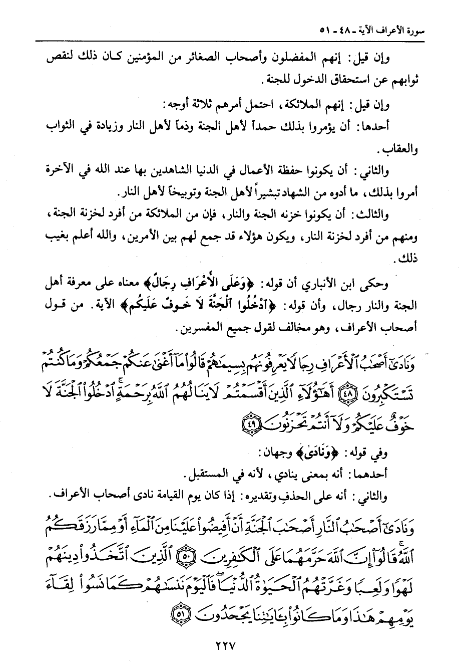 وإن قيل: إنهم المفضلون وأصحاب الصغائر من المؤمنين كان ذلك لنقص ثوابهم عن استحقاق الدخول للجنة. وإن قيل: إنهم الملائكة , احتمل أمرهم ثلاثة أوجه: أحدها: أن يؤمروا بذلك حمداً لأهل الجنة وذماً لأهل النار وزيادة في الثواب والعقاب. والثاني: أن يكونوا حفظة الأعمال في الدنيا الشاهدين بها عند الله في الآخرة أمروا بذلك , ما أدوه من الشهادة تبشيراً لأهل الجنة وتوبيخاً لأهل النار. والثالث: أن يكونوا خزنه الجنة والنار , فإن من الملائكة من أفرد لخزنة الجنة , ومنهم من أفرد لخزنة النار , ويكون هؤلاء قد جمع لهم بين الأمرين , والله أعلم بغيب ذلك. وحكى ابن الأنباري أن قوله: {وَعَلَى الأَعْرَافِ رِجَالٌ} معناه على معرفة أهل الجنة والنار رجال , وأن قوله: {ادْخُلُواْ الْجَنَّةَ لاَ خَوفٌ عَلَيكُم} الآية من قول أصحاب الأعراف , وهو مخالف لقول جميع المفسرين.