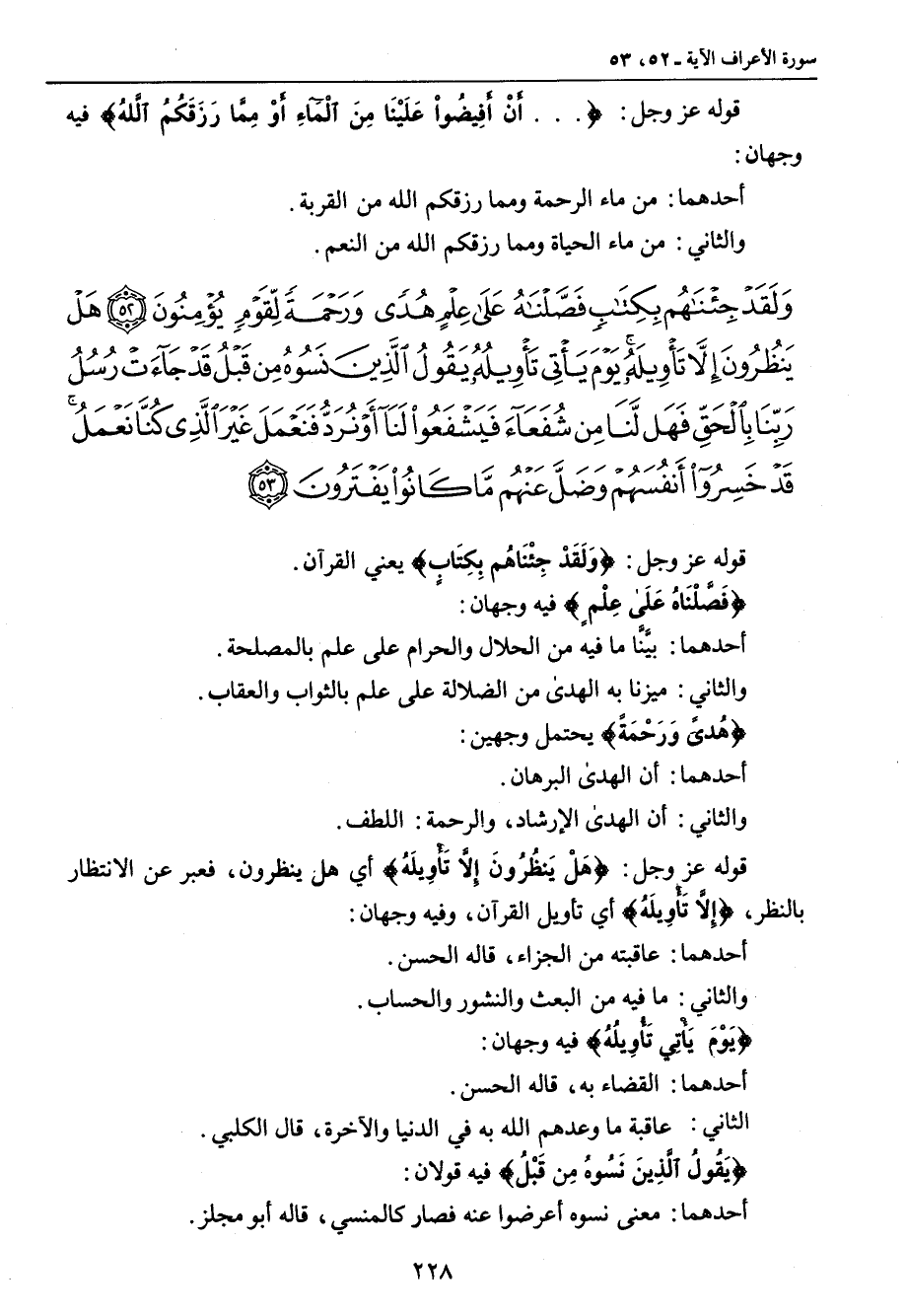{ولقد جئناهم بكتاب فصلناه على علم هدى ورحمة لقوم يؤمنون هل ينظرون إلا تأويله يوم يأتي تأويله يقول الذين نسوه من قبل قد جاءت رسل ربنا بالحق فهل لنا من شفعاء فيشفعوا لنا أو نرد فنعمل غير الذي كنا نعمل قد خسروا أنفسهم وضل عنهم ما كانوا يفترون} قوله عز وجل: {وَلَقَدْ جِئْنَاهُم بِكِتَابٍ} يعني القرآن. {فصَّلْنَاهُ عَلَى عِلْمٍ} فيه وجهان: أحدهما: بيَّنَّا ما فيه من الحلال والحرام على علم بالمصلحة. والثاني: ميزنا به الهدى من الضلالة على علم بالثواب والعقاب. {هُدىً وَرَحْمَةً} يحتمل وجهين: أحدهما: أن الهدى البرهان. والثاني: أن الهدى الإرشاد , والرحمة: اللطف. قوله عز وجل: {هَلْ يَنظُرُونَ إِلاَّ تَأْوِيلَهُ} أي هل ينظرون , فعبر عن الانتظار بالنظر , {إِلاَّ تَأْوِيلَهُ} أي تأويل القرآن , وفيه وجهان: أحدهما: عاقبته من الجزاء , قاله الحسن. والثاني: ما فيه من البعث والنشور والحساب. {يَوْمَ يَأْتِي تَأْوِيلُهُ} فيه وجهان: أحدهما: القضاء به , قاله الحسن. الثاني: عاقبة ما وعدهم الله به في الدنيا والآخرة , قال الكلبي. {يَقُولُ الَّذِينَ نَسُوهُ مِن قَبْلُ} فيه قولان: أحدهما: معنى نسوه أعرضوا عنه فصار كالمنسي , قاله أبو مجلز.