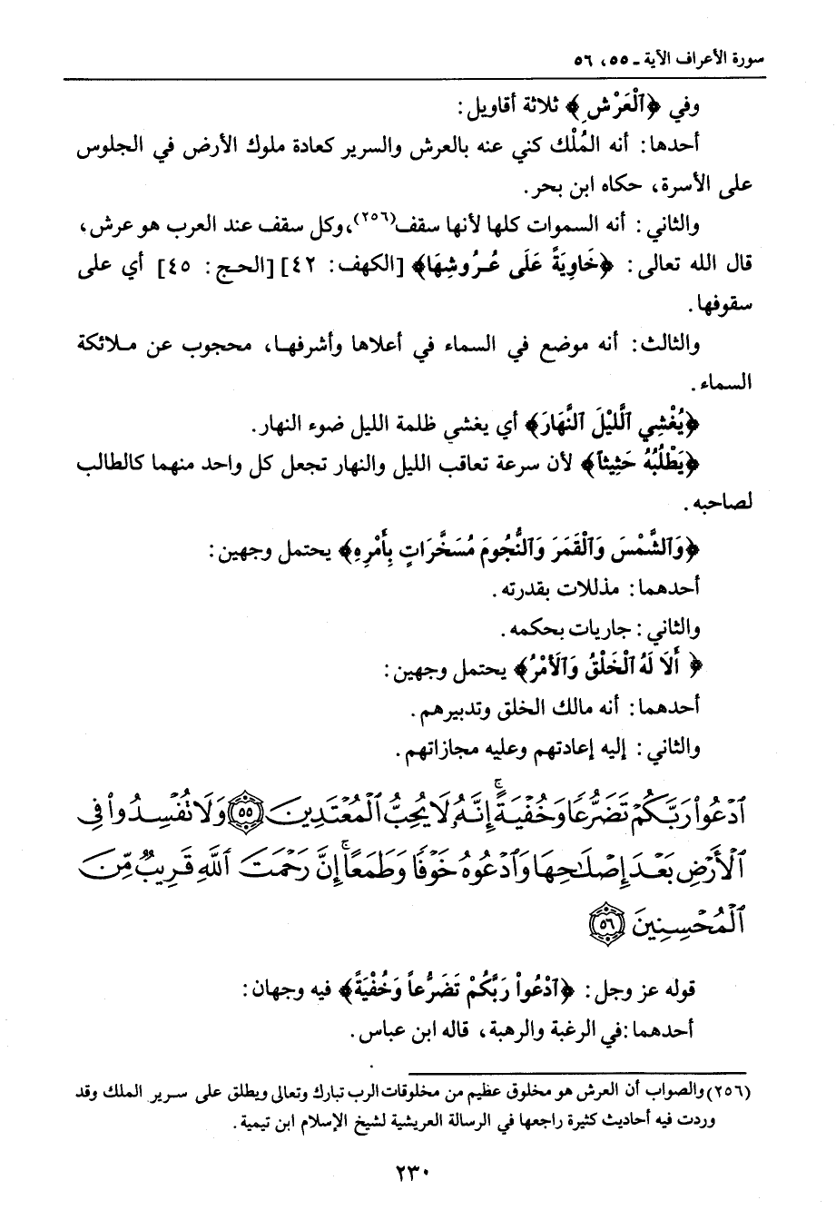 وفي {الْعَرْشِ} ثلاثة أقاويل: أحدها: أنه المُلْك كني عنه بالعرش والسرير كعادة ملوك الأرض في الجلوس على الأسرة , حكاه ابن بحر. والثاني: أنه السموات كلها لأنها سقف , وكل سقف عند العرب هو عرش , قال الله تعالى: {خَاوِيَةً عَلَى عُرُوشِهَا} [الكهف: 42] [الحج: 45] أي على سقوفها. والثالث: أنه موضع في السماء في أعلاها وأشرفها , محجوب عن ملائكة السماء. {يُغْشِي اللَّيْلَ النَّهَارَ} أي يغشي ظلمة الليل ضوء النهار. {يَطْلُبُهُ حَثِيثاً} لأن سرعة تعاقب الليل والنهار تجعل كل واحد منهما كالطالب لصاحبه. {وَالشَّمْسَ وَالْقَمَرَ وَالنُّجُومَ مُسَخَّرَاتٍ بِأَمْرِهِ} يحتمل وجهين: أحدهما: مذللات بقدرته. والثاني: جاريات بحكمه. {أَلاَ لَهُ الْخَلْقُ وَالأَمْرُ} يحتمل وجهين: أحدهما: أنه مالك الخلق وتدبيرهم. والثاني: إليه إعادتهم وعليه مجازاتهم.