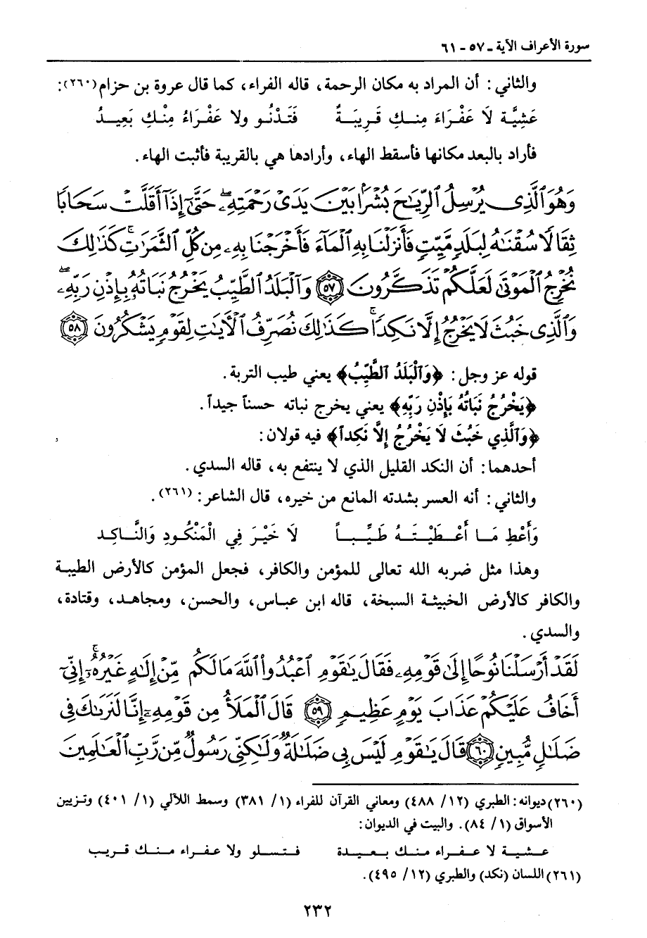 {وهو الذي يرسل الرياح بشرا بين يدي رحمته حتى إذا أقلت سحابا ثقالا سقناه لبلد ميت فأنزلنا به الماء فأخرجنا به من كل الثمرات كذلك نخرج الموتى لعلكم تذكرون والبلد الطيب يخرج نباته بإذن ربه والذي خبث لا يخرج إلا نكدا كذلك نصرف الآيات لقوم يشكرون} قوله عز وجل: {وَالْبَلَدُ الطَّيِّبُ} يعني طيب التربة. {يَخْرُجُ نَبَاتُهُ بِإِذْنِ رَبِّهِ} يعني يخرج نباته حسناً جيداً. {وَالَّذِي خَبُثَ لاَ يَخْرُجُ إِلاَّ نَكِداً} فيه قولان: أحدهما: أن النكد القليل الذي لا ينتفع به , قاله السدي. والثاني: أنه العسر بشدته المانع من خيره , قال الشاعر:
