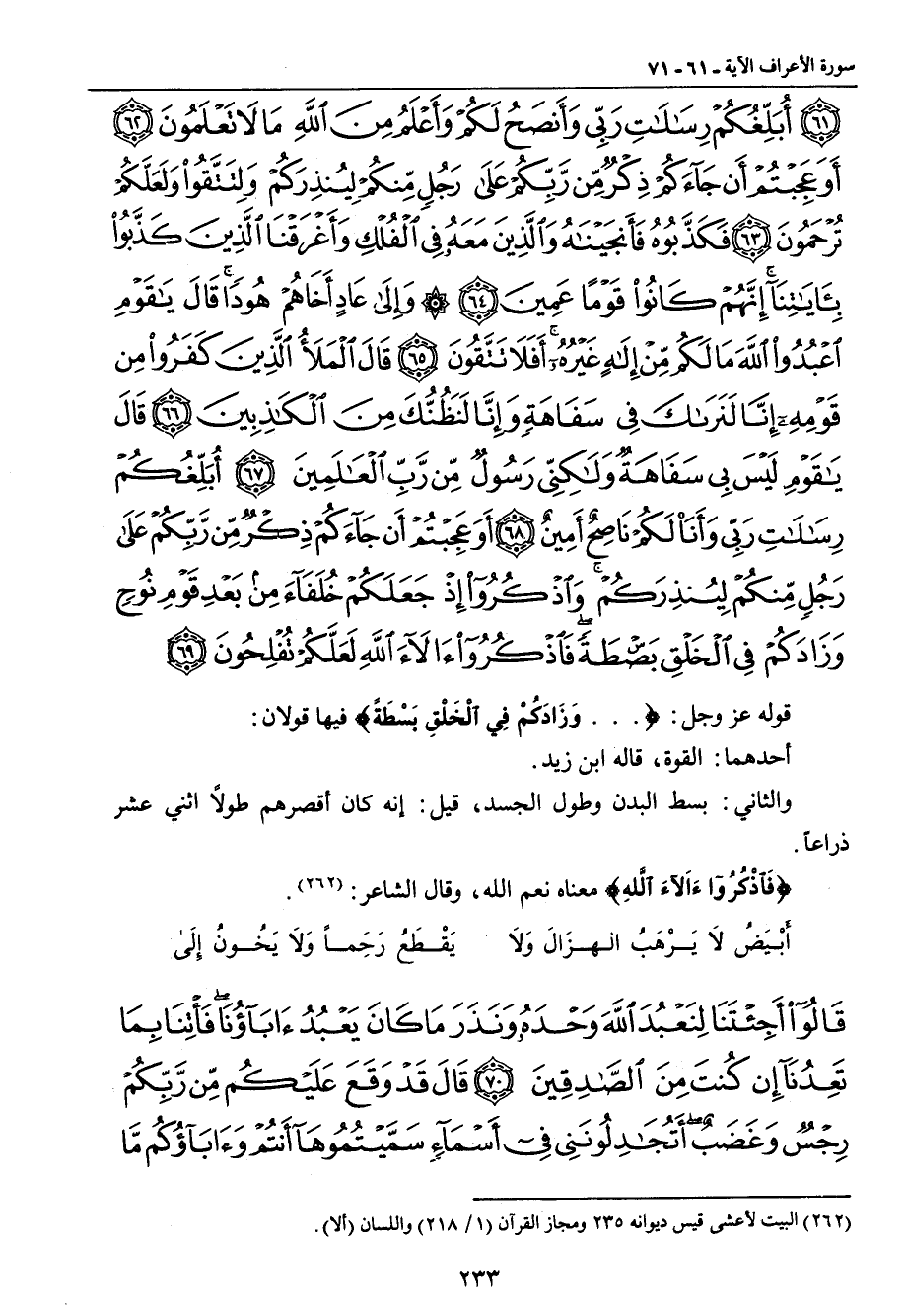 أبلغكم رسالات ربي وأنصح لكم وأعلم من الله ما لا تعلمون أوعجبتم أن جاءكم ذكر من ربكم على رجل منكم لينذركم ولتتقوا ولعلكم ترحمون فكذبوه فأنجيناه والذين معه في الفلك وأغرقنا الذين كذبوا بآياتنا إنهم كانوا قوما عمين وإلى عاد أخاهم هودا قال يا قوم اعبدوا الله ما لكم من إله غيره أفلا تتقون قال الملأ الذين كفروا من قومه إنا لنراك في سفاهة وإنا لنظنك من الكاذبين قال يا قوم ليس بي سفاهة ولكني رسول من رب العالمين أبلغكم رسالات ربي وأنا لكم ناصح أمين أوعجبتم أن جاءكم ذكر من ربكم على رجل منكم لينذركم واذكروا إذ جعلكم خلفاء من بعد قوم نوح وزادكم في الخلق بسطة فاذكروا آلاء الله لعلكم تفلحون} قوله عز وجل: { ... وَزَادَكُمْ فِي الْخَلْقِ بَسْطَةً} فيها قولان: أحدهما: القوة , قاله ابن زيد. والثاني: بسط البدن وطول الجسد , قيل: إنه كان أقصرهم طولاً اثني عشر ذراعاً. {فَاذْكُرُواءَالآءَ اللَّهِ} معناه نعم الله , وقال الشاعر: