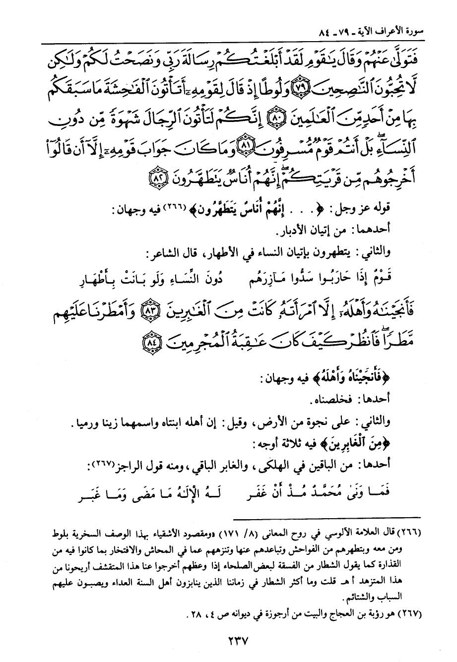 {فتولى عنهم وقال يا قوم لقد أبلغتكم رسالة ربي ونصحت لكم ولكن لا تحبون الناصحين ولوطا إذ قال لقومه أتأتون الفاحشة ما سبقكم بها من أحد من العالمين إنكم لتأتون الرجال شهوة من دون النساء بل أنتم قوم مسرفون وما كان جواب قومه إلا أن قالوا أخرجوهم من قريتكم إنهم أناس يتطهرون} قوله عز وجل: { ... إِنَّهُمْ أُنَاسٌ يَتَطَّهَّرُونَ} فيه وجهان: أحدهما: من إتيان الأدبار. والثاني: يتطهرون بإتيان النساء في الأطهار , قال الشاعر:
