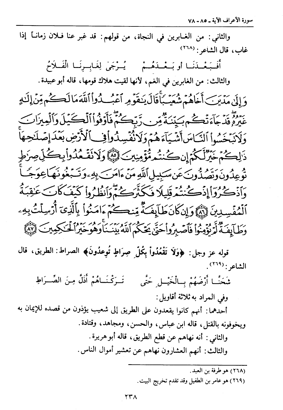 {وإلى مدين أخاهم شعيبا قال يا قوم اعبدوا الله ما لكم من إله غيره قد جاءتكم بينة من ربكم فأوفوا الكيل والميزان ولا تبخسوا الناس أشياءهم ولا تفسدوا في الأرض بعد إصلاحها ذلكم خير لكم إن كنتم مؤمنين ولا تقعدوا بكل صراط توعدون وتصدون عن سبيل الله من آمن به وتبغونها عوجا واذكروا إذ كنتم قليلا فكثركم وانظروا كيف كان عاقبة المفسدين وإن كان طائفة منكم آمنوا بالذي أرسلت به وطائفة لم يؤمنوا فاصبروا حتى يحكم الله بيننا وهو خير الحاكمين} قوله عز وجل: {وَلاَ تَقْعُدُواْ بِكُلِّ صِرَاطٍ تُوِعَدُونَ} الصراط: الطريق , قال الشاعر: