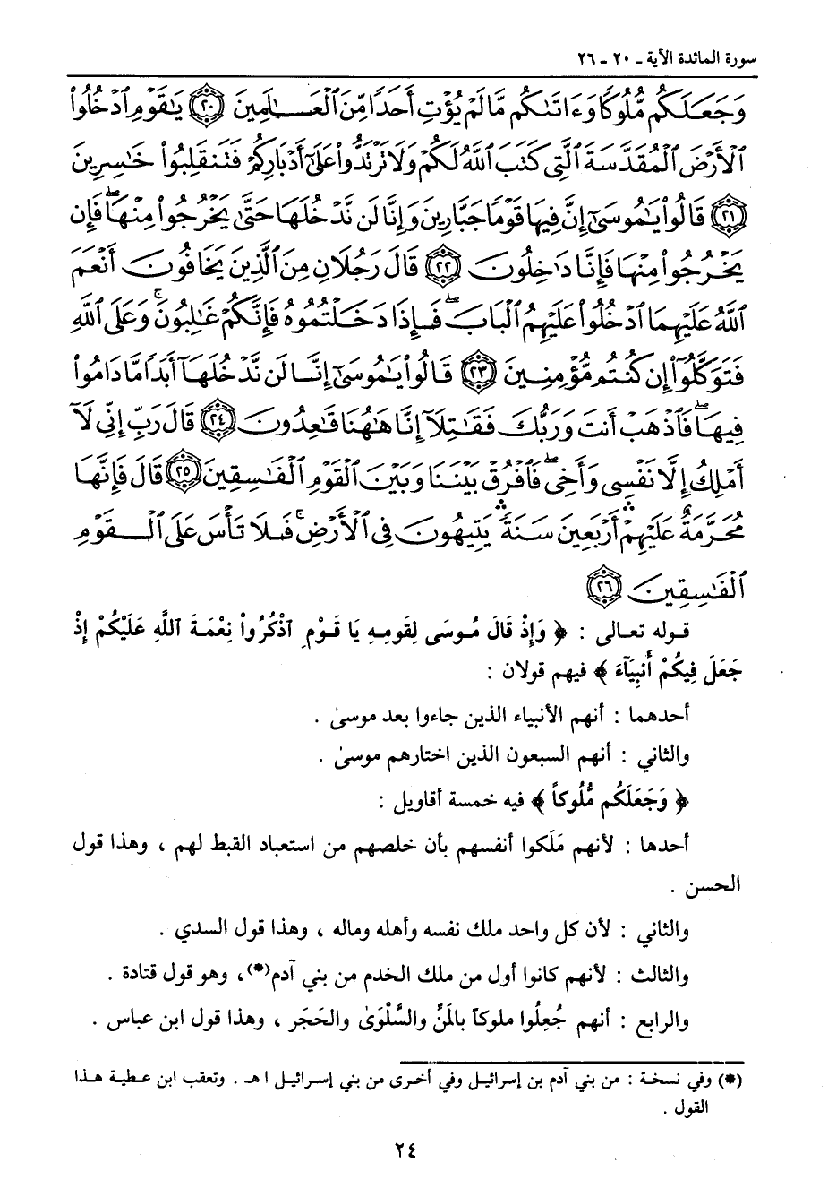 وجعلكم ملوكا وآتاكم ما لم يؤت أحدا من العالمين يا قوم ادخلوا الأرض المقدسة التي كتب الله لكم ولا ترتدوا على أدباركم فتنقلبوا خاسرين قالوا يا موسى إن فيها قوما جبارين وإنا لن ندخلها حتى يخرجوا منها فإن يخرجوا منها فإنا داخلون قال رجلان من الذين يخافون أنعم الله عليهما ادخلوا عليهم الباب فإذا دخلتموه فإنكم غالبون وعلى الله فتوكلوا إن كنتم مؤمنين قالوا يا موسى إنا لن ندخلها أبدا ما داموا فيها فاذهب أنت وربك فقاتلا إنا ها هنا قاعدون قال رب إني لا أملك إلا نفسي وأخي فافرق بيننا وبين القوم الفاسقين قال فإنها محرمة عليهم أربعين سنة يتيهون في الأرض فلا تأس على القوم الفاسقين} قوله تعالى: {وَإِذْ قَالَ مُوسَى لِقَومِهِ يا قَوْمِ اذْكُرُواْ نِعْمَةَ اللَّهِ عَلَيْكُمْ إِذْ جَعَلَ فِيكُمْ أَنْبِيَآءَ} فيهم قولان. أحدهما: أنهم الأنبياء الذين جاءوا بعد موسى. والثاني: أنهم السبعون الذين اختارهم موسى. {وَجَعَلَكُم مُّلُوكاً} فيه خمسة أقاويل: أحدها: لأنهم مَلَكوا أنفسهم بأن خلصهم من استعباد القبط لهم , وهذا قول الحسن. والثاني: لأن كل واحد ملك نفسه وأهله وماله , وهذا قول السدي. والثالث: لأنهم كانوا أول من ملك الخدم من بني آدم , وهو قول قتادة. والرابع: أنهم جُعِلُوا ملوكاً بالمَنِّ والسَّلْوَى والحَجَر , وهذا قول ابن عباس.