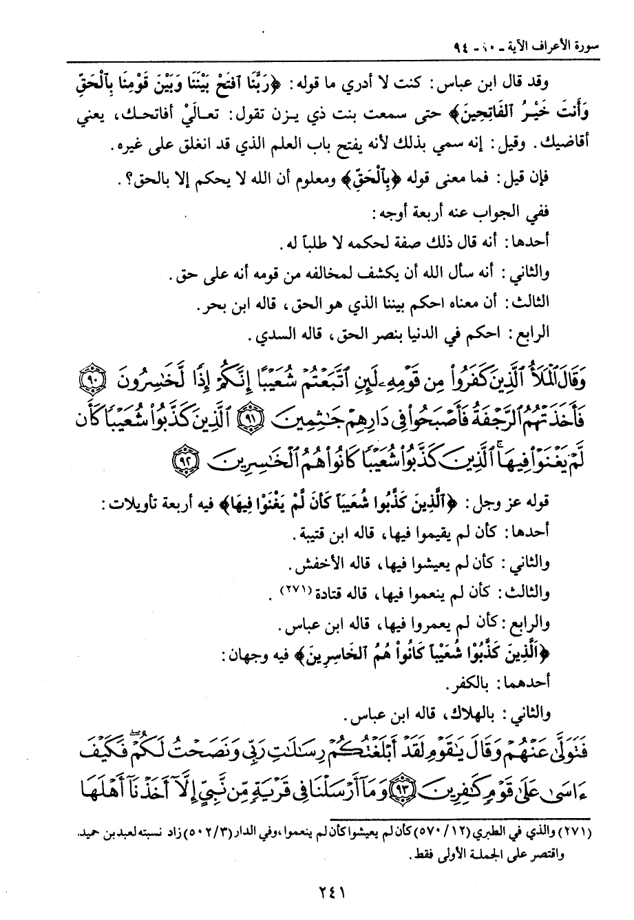 {وقال الملأ الذين كفروا من قومه لئن اتبعتم شعيبا إنكم إذا لخاسرون فأخذتهم الرجفة فأصبحوا في دارهم جاثمين الذين كذبوا شعيبا كأن لم يغنوا فيها الذين كذبوا شعيبا كانوا هم الخاسرين} قوله عز وجل: {الَّذِينَ كَذَّبُواْ شُعَيبَاً كَأنَ لَّمْ يَغْنَوْا فِيهَا} فيه أربعة تأويلات: أحدها: كأنك لم يقيموا فيها , قاله ابن قتيبة. والثاني: كأن لم يعيشوا فيها , قاله الأخفش. والثالث: كأن لم ينعموا فيها , قاله قتادة. والرابع: كأن لم يعمروا فيها , قاله ابن عباس. {الَّذِينَ كَذَّبُوْا شُعَيْباً كَانُواْ هَمُ الخَاسِرِينَ} فيه وجهان: أحدهما: بالكفر. والثاني: بالهلاك , قاله ابن عباس.