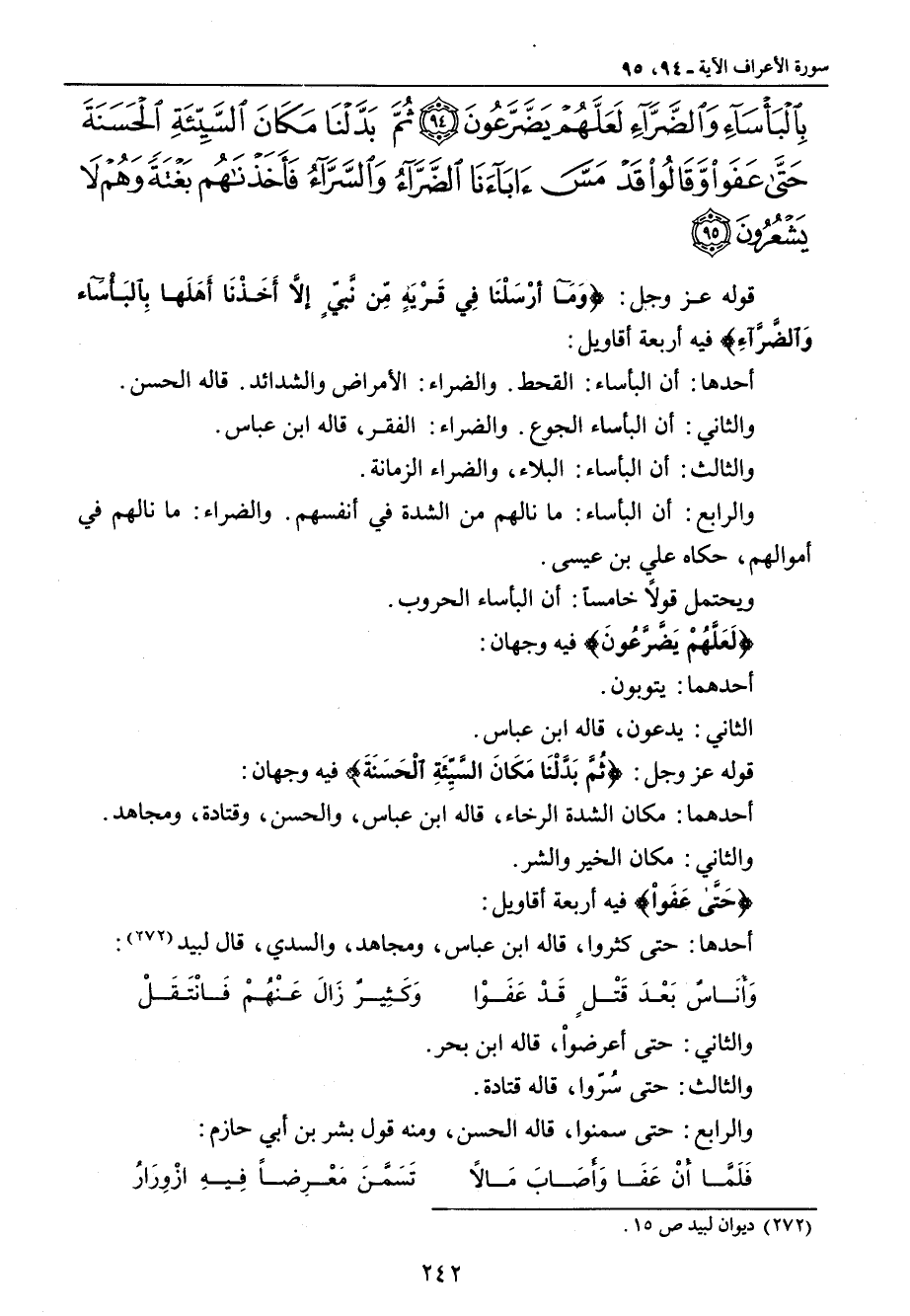 بالبأساء والضراء لعلهم يضرعون ثم بدلنا مكان السيئة الحسنة حتى عفوا وقالوا قد مس آباءنا الضراء والسراء فأخذناهم بغتة وهم لا يشعرون} قوله عز وجل: {وَمَآ أرْسَلْنَا فِي قَرْيَةٍ مِّن نَّبِّيٍ إلاَّ أَخَذْنَا أَهْلَها بِالبَأْسآءِ وَالضَّرَّآءِ} فيه أربعة أقاويل: أحدها: أن البأساء: القحط , والضراء: الأمراض والشدائد , قاله الحسن. والثاني: أن البأساء الجوع , والضراء: الفقر , قاله ابن عباس. والثالث: أن البأساء: البلاء , والضراء الزمانة. والرابع: أن البأساء: ما نالهم من الشدة في أنفسهم. والضراء: ما نالهم في أموالهم , حكاه علي بن عيسى. ويحتمل قولاً خامساً: أن البأساء الحروب. {لَعَلَّهُمْ يَضَّرَّعُونَ} فيه وجهان: أحدهما: يتوبون. الثاني: يدعون , قاله ابن عباس. قوله عز وجل: {ثُمَّ بَدَّلْنَا مَكَانَ السَّيِّئَةِ الْحَسَنَةَ} فيه وجهان: أحدهما: مكان الشدة الرخاء , قاله ابن عباس , والحسن , وقتادة , ومجاهد. والثاني: مكان الخير والشر. {حَتَّى عَفَواْ} فيه أربعة أقاويل: أحدها: حتى كثروا , قاله ابن عباس , ومجاهد , والسدي , قال لبيد:
