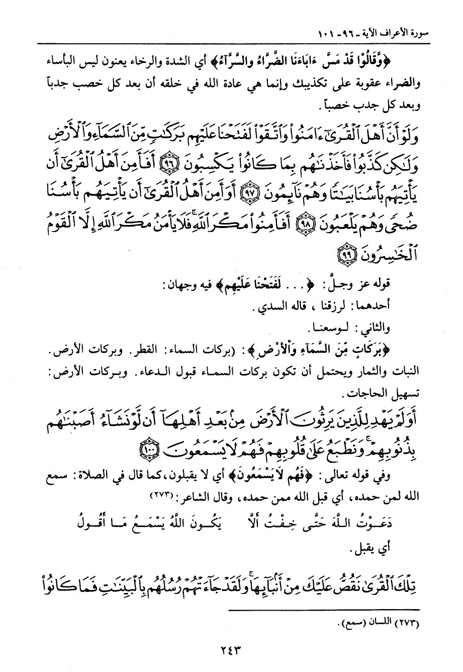 {ولو أن أهل القرى آمنوا واتقوا لفتحنا عليهم بركات من السماء والأرض ولكن كذبوا فأخذناهم بما كانوا يكسبون أفأمن أهل القرى أن يأتيهم بأسنا بياتا وهم نائمون أو أمن أهل القرى أن يأتيهم بأسنا ضحى وهم يلعبون أفأمنوا مكر الله فلا يأمن مكر الله إلا القوم الخاسرون} قوله عز وجلَّ: { ... لَفَتَحْنَا عَلَيْهِم} فيه وجهان: أحدهما: لرزقنا , قاله السدي. والثاني: لوسعنا. {بَرَكَاتٍ مِّنَ السَّمَآءِ وَالأَرْضِ}: (بركات السماء: القطر. وبركات الأرض. النبات والثمار ويحتمل أن تكون بركات السماء قبول الدعاء. وبركات الأرض: تسهيل الحاجات.