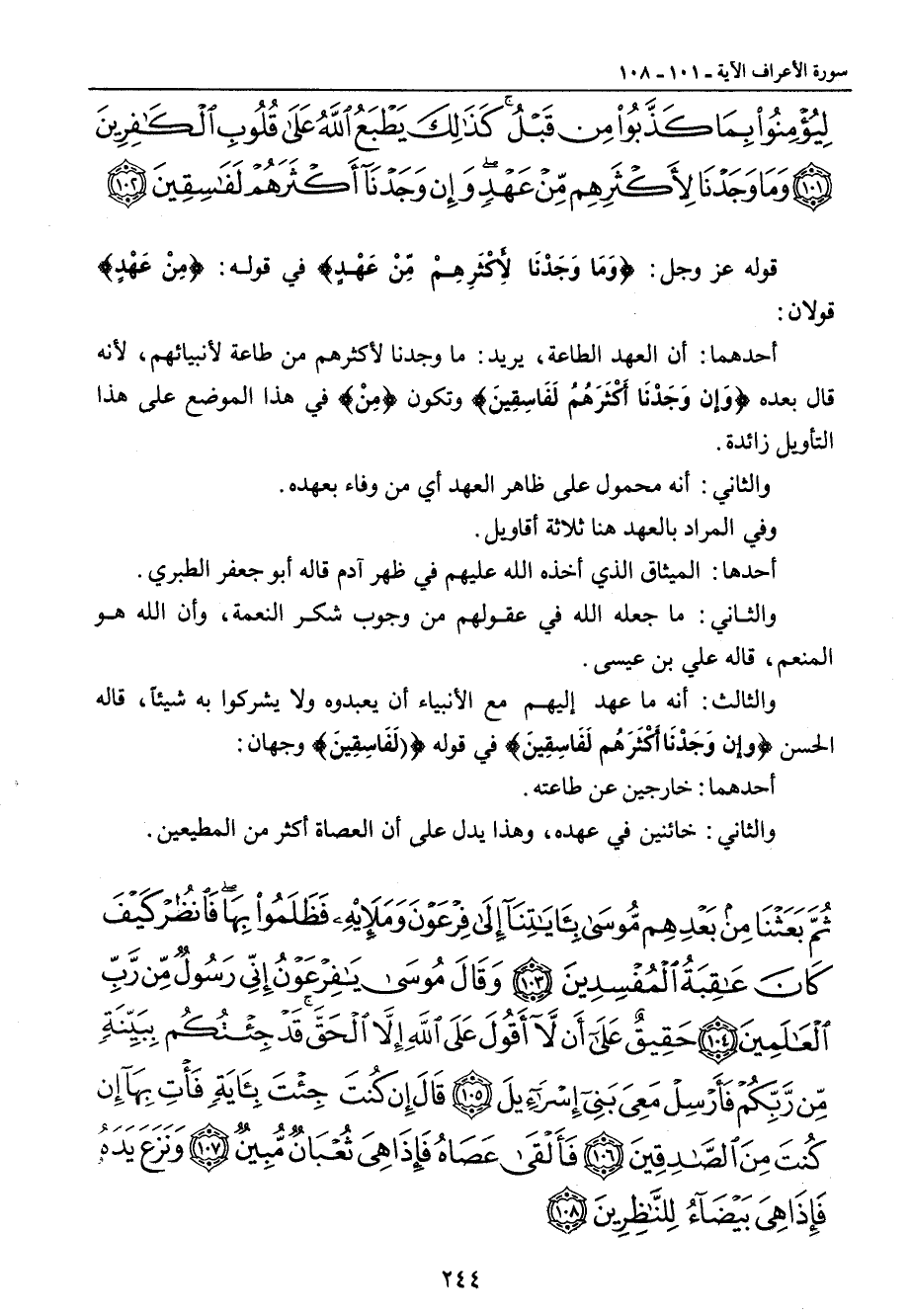ليؤمنوا بما كذبوا من قبل كذلك يطبع الله على قلوب الكافرين وما وجدنا لأكثرهم من عهد وإن وجدنا أكثرهم لفاسقين} قوله عز وجل: {وَمَا وَجَدْنَا لأَكْثَرِهِمْ مِّنْ عَهْدٍ} في قوله: {مِنْ عَهْدٍ} قولان: أحدهما: أن العهد الطاعة , يريد: ما وجدنا لأكثرهم من طاعة لأنبيائهم , لأنه قال بعده {وَإن وَجَدْنَا أَكْثَرَهُمُ لَفَاسِقِينَ} وتكون {مِنْ} في هذا الموضع على هذا التأويل زائدة. والثاني: أنه محمول على ظاهر العهد أي من وفاء بعهده. وفي المراد بالعهد هنا ثلاثة أقاويل. أحدها: الميثاق الذي أخذه الله عليهم في ظهر آدم قاله أبو جعفر الطبري. والثاني: ما جعله الله في عقولهم من وجوب شكر النعمة , وأن الله هو المنعم , قاله علي بن عيسى. والثالث: أنه ما عهد إليهم مع الأنبياء أن يعبدوه ولا يشركوا به شيئاً , قاله الحسن {وإن وَجَدْنَا أَكْثَرَهُم لَفَاسِقِينَ} في قوله {لَفَاسِقِينَ} وجهان: أحدهما: خارجين عن طاعته. والثاني: خائنين في عهده , وهذا يدل على أن العصاة أكثر من المطيعين.