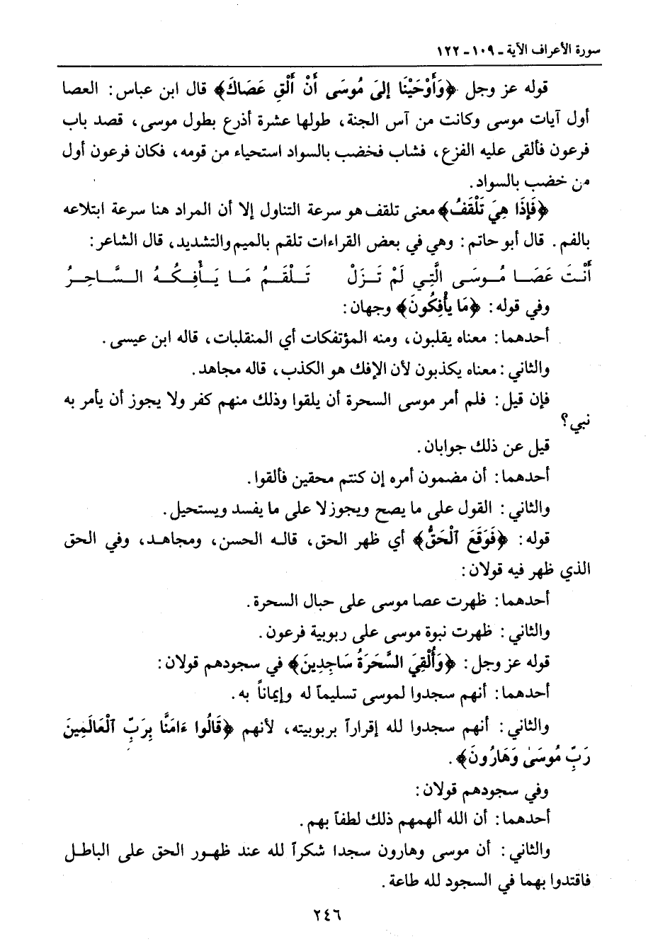 وفي قوله: {مَا يأْفِكُونَ} وجهان: أحدهما: معناه يقلبون , ومنه المؤتفكات أي المنقلبات , قاله ابن عيسى. والثاني: معناه يكذبون لأن الإفك هو الكذب , قاله مجاهد. فإن قيل: فلم أمر موسى السحرة أن يلقو وذلك منهم كفر ولا يجوز أن يأمر به نبي؟ قيل عن ذلك جوابان. أحدهما: أن مضمون أمره إن كنتم محقين فألقوا. والثاني: القول على ما يصح ويجوز لا على ما يفسد ويستحيل. قوله: {فَوَقَعَ الْحَقُّ} أي ظهر الحق , قاله الحسن , ومجاهد , وفي الحق الذي ظهر فيه قولان: أحدهما: ظهرت عصا موسى على حبال السحرة. والثاني: ظهرت نبوة موسى على ربوبية فرعون. قوله عز وجل: {وَأُلْقِيَ السَّحَرَةُ سَاجِدِينَ} في سجودهم قولان: أحدهما: أنهم سجدوا لموسى تسليماً له وإيماناً به. والثاني: أنهم سجدوا لله إقراراً بربوبيته , لأنهم {قَالُواءَامَنَّا بِرَبِّ الْعَالَمِينَ رَبِّ مُوسَى وَهَارُونَ}. وفي سجودهم قولان: أحدهما: أن الله ألهمهم ذلك لطفاً بهم. والثاني: أن موسى وهارون سجدا شكراً لله عند ظهور الحق على الباطل فاقتدوا بهما في السجود لله طاعة.