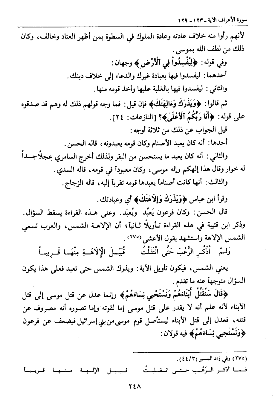 يعني الشمس , فيكون تأويل الآية: ويذرك والشمس حتى تعبد فعلى هذا يكون السؤال متوجهاً عنه ما تقدم. {قَالَ سَنُقَتِّلُ أَبْنَاءَهُمْ وَنَسْتَحْيي نِسَاءَهُمْ} وإنما عدل عن قتل موسى إلى قتل الأبناء لأنه علم أنه لا يقدر عل قتل موسى إما لقوته وإما تصوره أنه مصروف عن قتله , فعدل إلى قتل الأبناء ليستأصل قوم موسى من بني إسرائيل فيضعف عن فرعون {وَنَسْتَحِيي نِسَاءَهُمُ} فيه قولان: