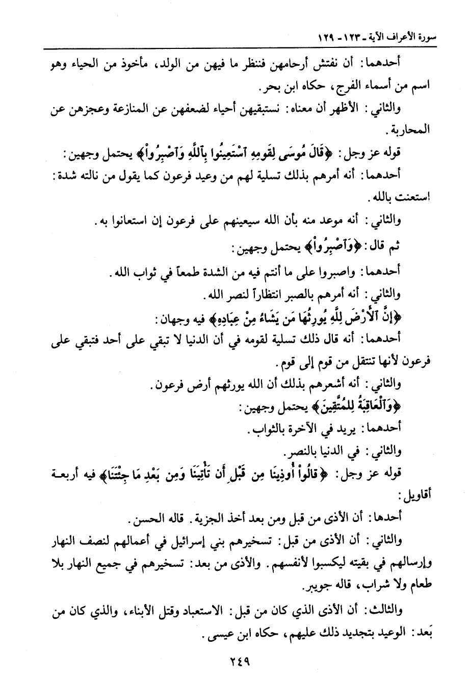 أحدهما: أن نفتش أرحامهن فننظر ما فيهن من الولد , مأخوذ من الحياء وهو اسم من أسماء الفرج , حكاه ابن بحر. والثاني: الأظهر أن معناه: نستبقيهن أحياء لضعفهن عن المنازعة وعجزهن عن المحاربة. قوله عز وجل: {قَالَ مُوسَى لِقَومِهِ اسْتَعِينُوا بِاللَّهِ وَاصْبِرُواْ} يحتمل وجهين: أحدهما: أنه أمرهم بذلك تسلية لهم من وعيد فرعون كما يقول من نالته شدة: استعنت بالله. والثاني: أنه موعد منه بأن الله سيعينهم على فرعون إن استعانوا به. ثم قال: {وَاصْبِرُواْ} يحتمل وجهين: أحدهما: واصبروا على ما أنتم فيه من الشدة طمعاً في ثواب الله. والثاني: أنه أمرهم بالصبر انتظاراً لنصر الله. {إنَّ الأَرْضِ لِلَّهِ يُورِثُهَا مَن يَشَاءُ مِنْ عِبَادِهِ} فيه وجهان: أحدهما: أنه قال ذلك تسلية لقومه في أن الدنيا لا تبقي على أحد فتبقي على فرعون لأنها تنتقل من قوم إلى قوم. والثاني: أنه أشعرهم بذلك أن الله يورثهم أرض فرعون. {وَالْعَاقِبَةُ لِلمُتَّقِينَ} يحتمل وجهين: أحدهما: يريد في الآخرة بالثواب. والثاني: في الدنيا بالنصر. قوله عز وجل: {قالُواْ أُوذِينَا مِن قَبْلِ أَن تَأْتِيَنَا وَمِن بَعْدِ مَا جِئْتَنَا} فيه أربعة أقاويل: أحدها: أن الأذى من قبل ومن بعد أخذ الجزية. قاله الحسن. والثاني: أن الأذى من قبل: تسخيرهم بني إسرائيل في أعمالهم لنصف النهار وإرسالهم في بقيته ليكسبوا لأنفسهم. والأذى من بعد: تسخيرهم في جميع النهار بلا طعام ولا شراب , قاله جويبر. والثالث: أن الأذى الذي كان من قبل: الاستعباد وقتل الأبناء , والذي كان من بَعد: الوعيد بتجديد ذلك عليهم , حكاه ابن عيسى.