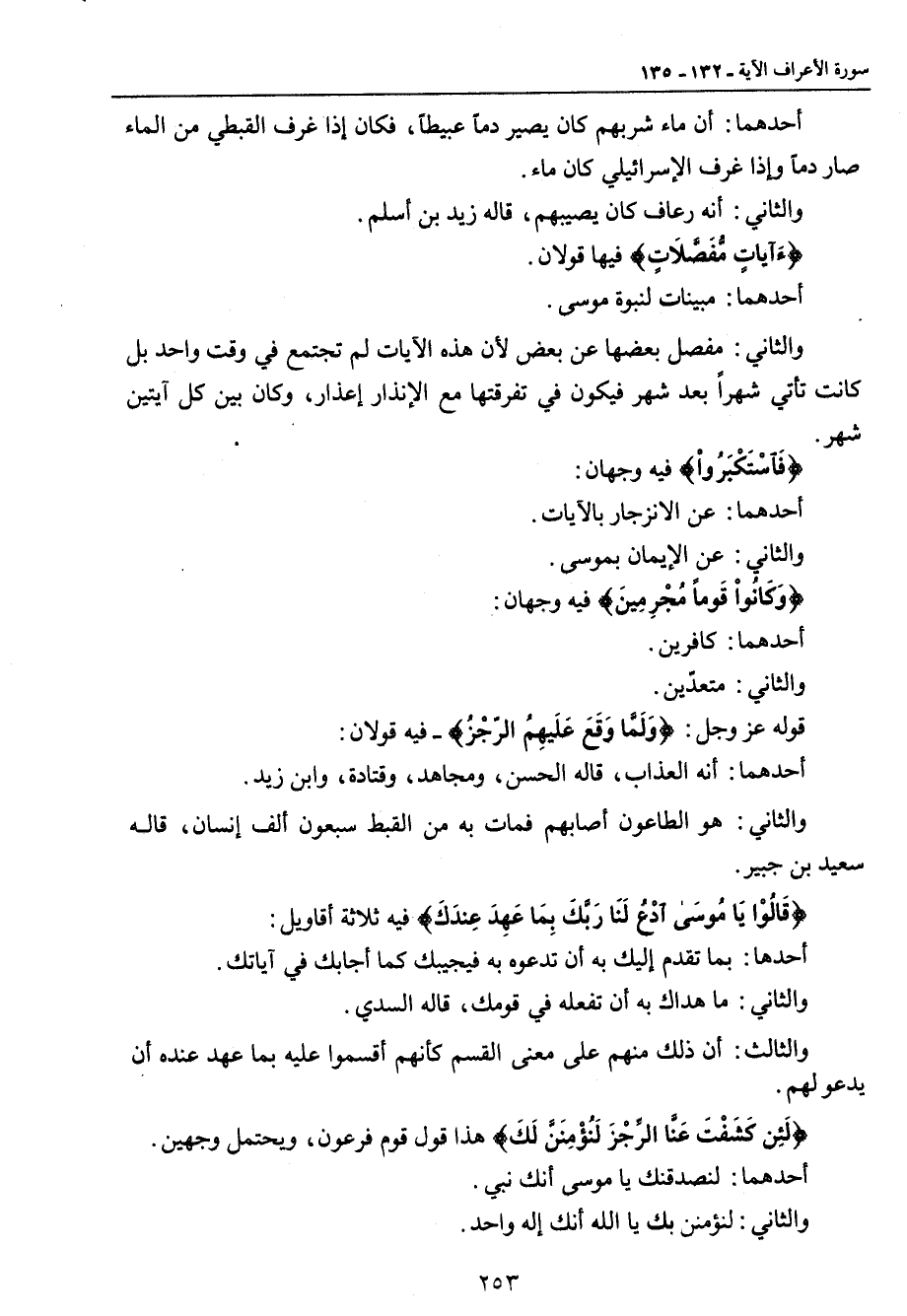 أحدهما: أن ماء شربهم كان يصير دماً عبيطاً , فكان إذا غرف القبطي من الماء صار دماً وإذا غرف الإسرائيلي كان ماء. والثاني: أنه رعاف كان يصيبهم , قاله زيد بن أسلم. {ءَاياتٍ مُّفَصَّلاَتٍ} فيها قولان: أحدهما: مبينات لنبوة موسى. والثاني: مفصل بعضها عن بعض لأن هذه الآيات لم تجتمع في وقت واحد بل كانت تأتي شهراً بعد شهر فيكون في تفرقتها مع الإنذار إعذار , وكان بين كل آيتين شهر. {فَاسْتَكْبَرُواْ} فيه وجهان: أحدهما: عن الانزجار بالآيات. والثاني: عن الإيمان بموسى. {وَكَانُواْ قَوماً مُجْرِمِينَ} فيه وجهان: أحدهما: كافرين. والثاني: متعدّين. قوله عز وجل: {وَلَمَّا وَقَعَ عَلَيهِمُ الرّجْزُ} - فيه قولان: أحدهما: أنه العذاب , قاله الحسن , ومجاهد , وقتادة , وابن زيد. والثاني: هو الطاعون أصابهم فمات به من القبط سبعون ألف إنسان , قاله سعيد بن جبير. {قَالُواْ يَا مُوسَى ادْعُ لَنَا رَبَّكَ بِمَا عَهِدَ عِندَكَ} فيه ثلاثة أقاويل: أحدها: بما تقدم إليك به أن تدعوه به فيجيبك كما أجابك في آياتك. والثاني: ما هداك به أن تفعله في قومك , قاله السدي. والثالث: أن ذلك منهم على معنى القسم كأنهم أقسموا عليه بما عهد عنده أن يدعو لهم. {لَئِن كَشَفْتَ عَنَّا الرِّجْزَ لَنُؤْمِنَنَّ لَكَ} هذا قول قوم فرعون , ويحتمل وجهين: أحدهما: لنصدقنك يا موسى أنك نبي. والثاني: لنؤمنن بك يا الله أنك إله واحد.