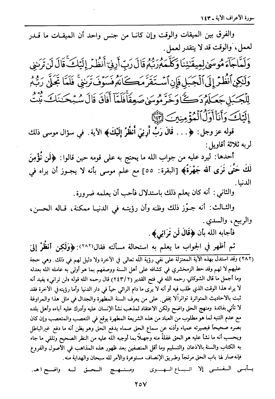 {ولما جاء موسى لميقاتنا وكلمه ربه قال رب أرني أنظر إليك قال لن تراني ولكن انظر إلى الجبل فإن استقر مكانه فسوف تراني فلما تجلى ربه للجبل جعله دكا وخر موسى صعقا فلما أفاق قال سبحانك تبت إليك وأنا أول المؤمنين} قوله عز وجل: { ... قَالَ رَبِّ أَرِني أَنظُرُ إِلَيْكَ} الآية , في سؤال موسى ذلك لربه ثلاثة أقاويل: أحدها: ليرد عليه من جواب الله ما يحتج به على قومه حين قالوا: {لَن نُؤْمِنَ لَكَ حَتَّى نَرَى اللَّهَ جَهْرَةً} [البقرة: 55] مع علم موسى بأنه لا يجوز أن يراه في الدنيا. والثاني: أنه كان يعلم ذلك باستدلال فأجب أن يعلمه ضرورة. والثالث: أنه جوّز ذلك وظنه وأن رؤيته في الدنيا ممكنة , قاله الحسن , والربيع , والسدي. فأجابه الله بأن {قَالَ لَن تَرَانِي}. ثم أظهر في الجواب ما يعلم به استحالة مسألته فقال: {وَلَكِن انظُرْ إلىَ