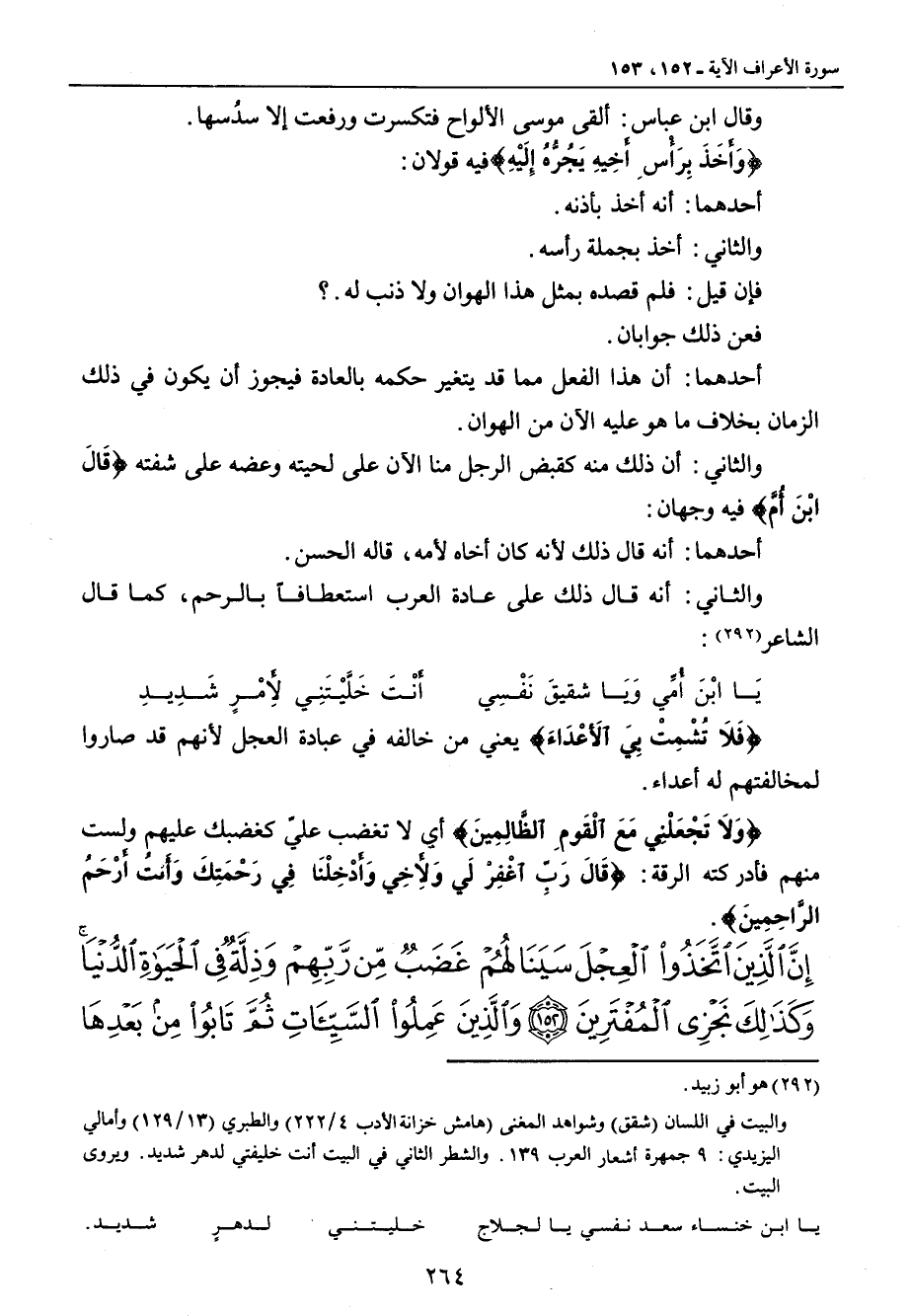 وقال ابن عباس: ألقى موسى الألواح فتكسرت ورفعت إلا سدُسها. {وَأَخَذَ بِرَأْسِ أَخِيهِ يَجُرُّهُ إِلَيْهِ} فيه قولان: أحدهما: أنه أخذ بأذنه. والثاني: أخذ بجملة رأسه. فإن قيل: فلم قصده بمثل هذا الهوان ولا ذنب له؟ فعن ذلك جوابان. أحدهما: أن هذا الفعل مما قد يتغير حكمه بالعادة فيجوز أن يكون في ذلك الزمان بخلاف ما هو عليه الآن من الهوان. والثاني: أن ذلك منه كقبض الرجل منا الآن على لحيته وعضه على شفته {قَالَ ابْنَ أُمَّ} فيه وجهان: أحدهما: أنه قال ذلك لأنه كان أخاه لأمه , قاله الحسن. والثاني: أنه قال ذلك على عادة العرب استعطافاً بالرحم , كما قال الشاعر: