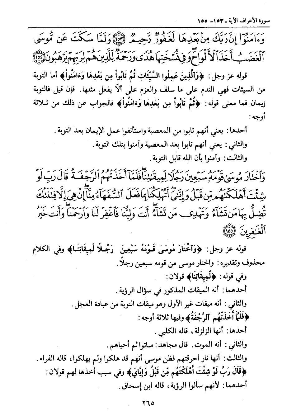 {واختار موسى قومه سبعين رجلا لميقاتنا فلما أخذتهم الرجفة قال رب لو شئت أهلكتهم من قبل وإياي أتهلكنا بما فعل السفهاء منا إن هي إلا فتنتك تضل بها من تشاء وتهدي من تشاء أنت ولينا فاغفر لنا وارحمنا وأنت خير الغافرين} قوله عز وجل: {وَاخْتَارَ مُوسَى قَوْمَهُ سَبْعِينَ رَجُلاً لّمِيقَاتِنَا} وفي الكلام محذوف وتقديره: واختار موسى من قومه سبعين رجلاً. وفي قوله: {لِّمِيقَاتِنَا} قولان: أحدهما: أنه الميقات المذكور في سؤال الرؤية. والثاني أنه ميقات غير الأول وهو ميقات التوبة من عبادة العجل. {فَلَمَّا أَخَذَتْهُمْ الرَّجْفَةُ} وفيها ثلاثة أوجه: أحدها: أنها الزلزلة , قاله الكلبي. والثاني: أنه الموت. قال مجاهد: ماتوا ثم أحياهم. والثالث: أنها نار أحرقتهم فظن موسى أنهم قد هلكوا ولم يهلكوا , قاله الفراء. {قَالَ رَبِّ لَوْ شِئْتَ أَهْلَكْتَهُم مِّن قَبْلُ وَإِيَّايَ} وفي سبب أخذها لهم قولان: أحدهما: لأنهم سألوا الرؤية , قاله ابن إِسحاق.
