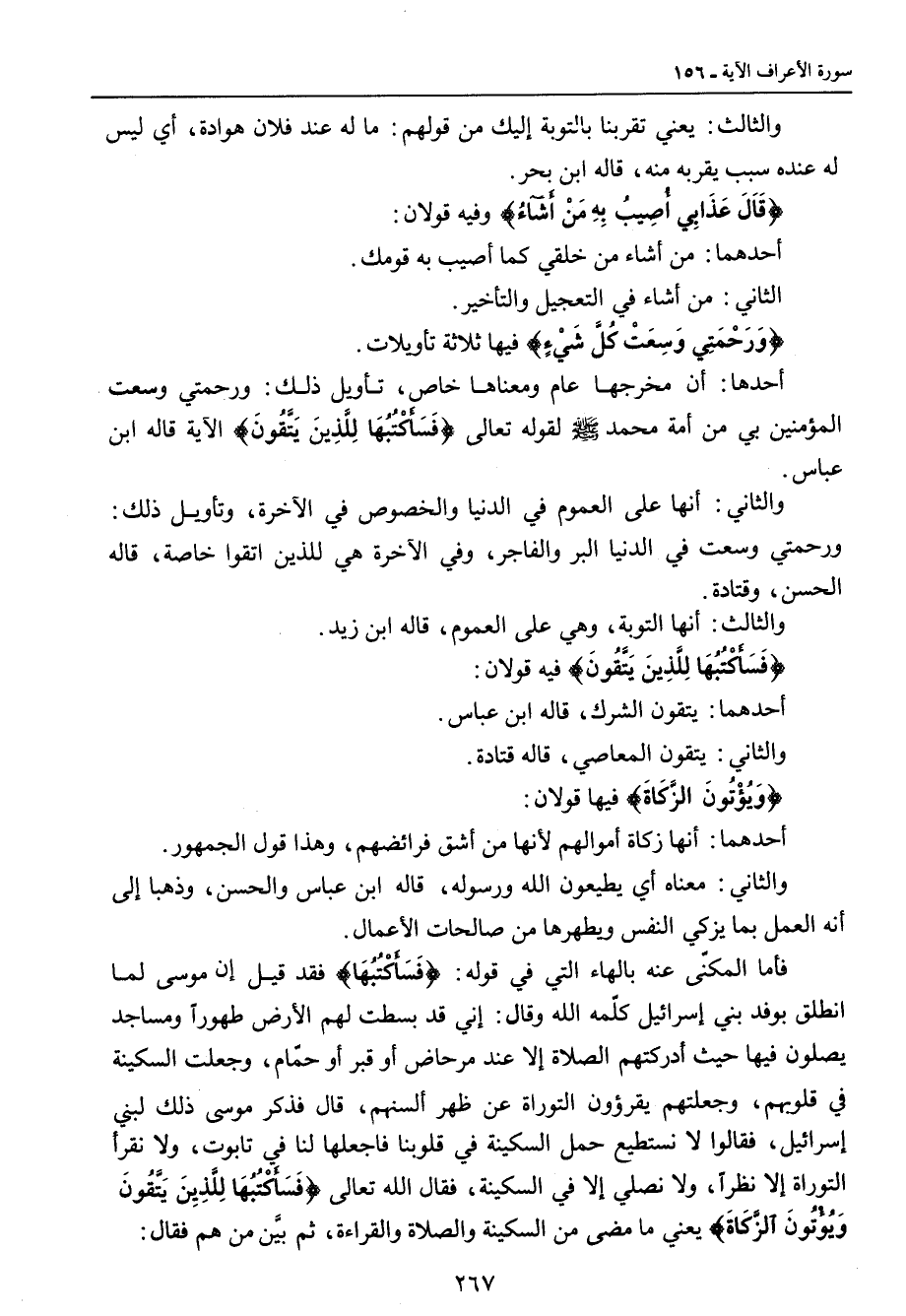 والثالث: يعني تقربنا بالتوبة إليك من قولهم: ما له عند فلان هوادة , أي ليس له عنده سبب يقربه منه , قاله ابن بحر. {قَالَ عَذَابِي أُصِيبُ بِهِ مَنْ أَشَآءُ} وفيه قولان: أحدهما: من أشاء من خلقي كما أصيب به قومك. الثاني: من أشاء في التعجيل والتأخير. {وَرَحْمَتِي وَسِعَتْ كُلَّ شَيْءٍ} فيها ثلاثة تأويلات: أحدها: أن مخرجها عام ومعناها خاص , تأويل ذلك: ورحمتي وسعت المؤمنين بي من أمة محمد صلى الله عليه وسلم لقوله تعالى {فَسَأَكْتُبُهَا لِلَّذِينَ يَتَّقُونَ} الآية قاله ابن عباس. والثاني: أنها على العموم في الدنيا والخصوص في الآخرة , وتأويل ذلك: ورحمتي وسعت في الدنيا البر والفاجر , وفي الآخرة هي للذين اتقوا خاصة , قاله الحسن , وقتادة. والثالث: أنها التوبة , وهي على العموم , قاله ابن زيد. {فَسَأَكْتُبُهَا لِلَّذِينَ يَتَّقُونَ} فيه قولان: أحدهما: يتقون الشرك , قاله ابن عباس. والثاني: يتقون المعاصي , قاله قتادة. {وَيُؤْتُونَ الزَّكَاةَ} فيها قولان: أحدهما: أنها زكاة أموالهم لأنها من أشق فرائضهم , وهذا قول الجمهور. والثاني: معناه أي يطيعون الله ورسوله , قاله ابن عباس والحسن , وذهبا إلى أنه العمل بما يزكي النفس ويطهرها من صالحات الأعمال. فأما المكنّى عنه بالهاء التي في قوله: {فَسَأَكْتُبُهَا} فقد قيل إن موسى لما انطلق بوفد بني إسرائيل كلّمه الله وقال: إني قد بسطت لهم الأرض طهوراً ومساجد يصلون فيها حيث أدركتهم الصلاة إلا عند مرحاض أو قبر أو حمّام , وجعلت السكينة في قلوبهم , وجعلتهم يقرؤون التوراة عن ظهر ألسنهم , قال فذكر موسى ذلك لبني إسرائيل , فقالوا لا نستطيع حمل السكينة في قلوبنا فاجعلها لنا في تابوت , ولا نقرأ التوراة إلا نظراً , ولا نصلي إلا في السكينة , فقال الله تعالى {فَسَأَكْتُبُهَا لِلَّذِينَ يَتَّقُونَ وَيُؤْتُونَ الزَّكَاةَ} يعني ما مضى من السكينة والصلاة والقراءة , ثم بيَّن من هم فقال: