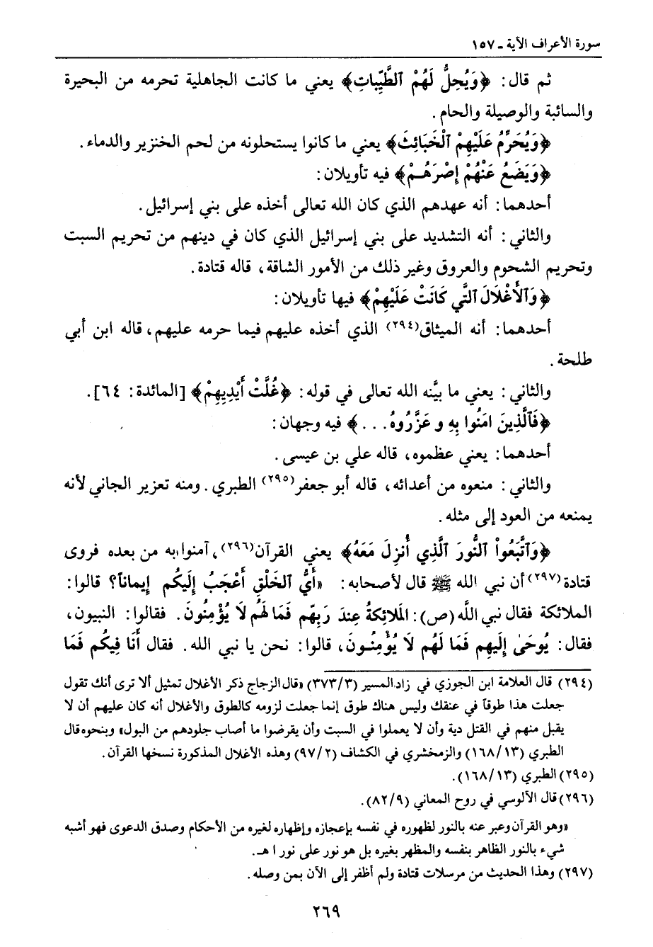 ثم قال: {وَيُحِلُّ لَهُمْ الطَّيِّباتِ} يعني ما كانت الجاهلية تحرمه من البحيرة والسائبة والوصيلة والحام. {وَيُحَرِّمُ عَلَيْهِمْ الْخَبَائِثَ} يعني ما كانوا يستحلونه من لحم الخنزير والدماء. {وَيَضَعُ عَنْهُمْ إِصْرَهُمْ} فيه تأويلان: أحدهما: أنه عهدهم الذي كان الله تعالى أخذه على بني إسرائيل. والثاني: أنه التشديد على بني إٍسرائيل الذي كان في دينهم من تحريم السبت وتحريم الشحوم والعروق وغير ذلك من الأمور الشاقة , قاله قتادة. {والأَغْلاَلَ التَّي كَانَتْ عَلَيهِمْ} فيها تأويلان: أحدهما: أنه الميثاق الذي أخذه عليهم فيما حرمه عليهم , قاله ابن أبي طلحة. والثاني: يعني ما بيَّنه الله تعالى في قوله: {غُلَّتْ أَيْدِيِهِمْ} [المائدة: 64]. {فَالَّذِينَ أَمَنُوا بِهِ وعَزَّرُوهُ ... } فيه وجهان: أحدهما: يعني عظموه , قاله علي بن عيسى. والثاني: منعوه من أعدائه , قاله أبو جعفر الطبري. ومنه تعزير الجاني لأنه يمنعه من العود إلى مثله. {وَاتَّبَعُواْ النُّورَ الَّذِي أُنزِلَ مَعَهُ} يعني القرآن , آمنوا به من بعده فروى قتادة أن نبي الله صلى الله عليه وسلم قال لأصحابه: (أَيُّ الخَلْقِ أَعْجَبُ إِلَيكُم إِيماناً؟) قالوا: الملائكة فقال نبي اللَّه (ص): (المَلائِكةُ عِندَ رَبِّهم فَمَا لَهُم لاَ يُؤْمِنُونَ.) فقالوا: النبيون , فقال: (يُوحَى إِلَيهِم فَمَا لَهُم لاَ يُؤْمِنُونَ) قالوا: نحن يا نبي الله. فقال (أَنَا فِيكُم فَمَا