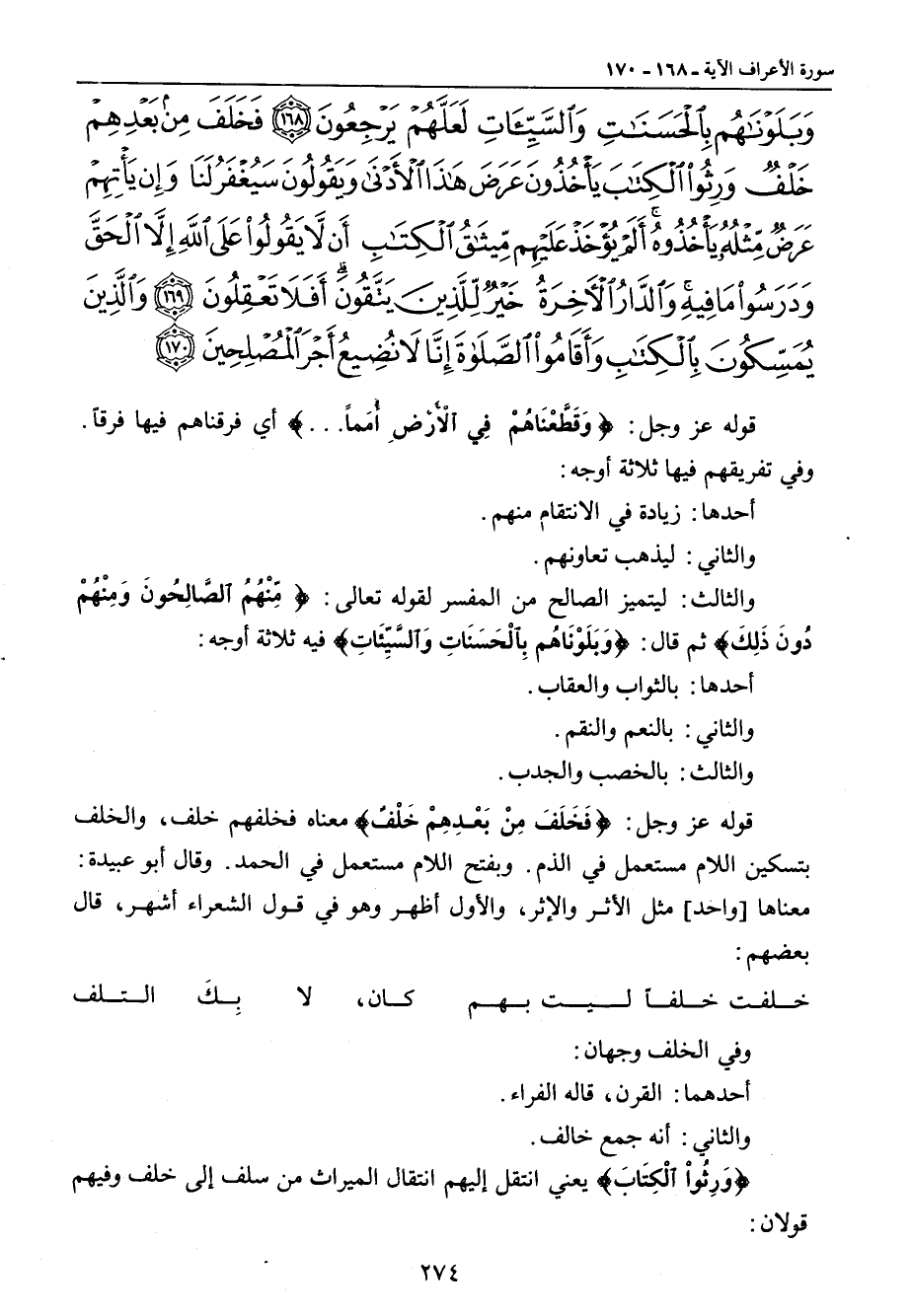 وبلوناهم بالحسنات والسيئات لعلهم يرجعون فخلف من بعدهم خلف ورثوا الكتاب يأخذون عرض هذا الأدنى ويقولون سيغفر لنا وإن يأتهم عرض مثله يأخذوه ألم يؤخذ عليهم ميثاق الكتاب أن لا يقولوا على الله إلا الحق ودرسوا ما فيه والدار الآخرة خير للذين يتقون أفلا تعقلون والذين يمسكون بالكتاب وأقاموا الصلاة إنا لا نضيع أجر المصلحين} قوله عز وجل: {وَقَطَّعْنَاهُمْ فِي الأَرْضِ أُمَماً ... } أي فرقناهم فيها فرقاً. وفي تفريقهم فيها ثلاثة أوجه: أحدها: زيادة في الانتقام منهم. والثاني: ليذهب تعاونهم. والثالث: ليتميز الصالح من المفسر لقوله تعالى: {مِّنْهُمُ الصَّالِحُونَ وَمِنْهُمْ دَونَ ذَلِكَ} ثم قال: {وَبَلَوْنَاهُم بِالْحَسَنَاتِ وَالسَّيِّئَاتِ} فيه ثلاثة أوجه: أحدها: بالثواب والعقاب. والثاني: بالنعم والنقم. والثالث: بالخصب والجدب. قوله عز وجل: {فَخَلَفَ مِنْ بَعْدِهِمْ خَلْفٌ} معناه فخلفهم خلف , والخلف بتسكين اللام مستعمل في الذم. وبفتح اللام مستعمل في الحمد. وقال أبو عبيدة. معناها [واحد] مثل الأثر والإثر , والأول أظهر وهو في قول الشعراء أشهر , قال بعضهم: