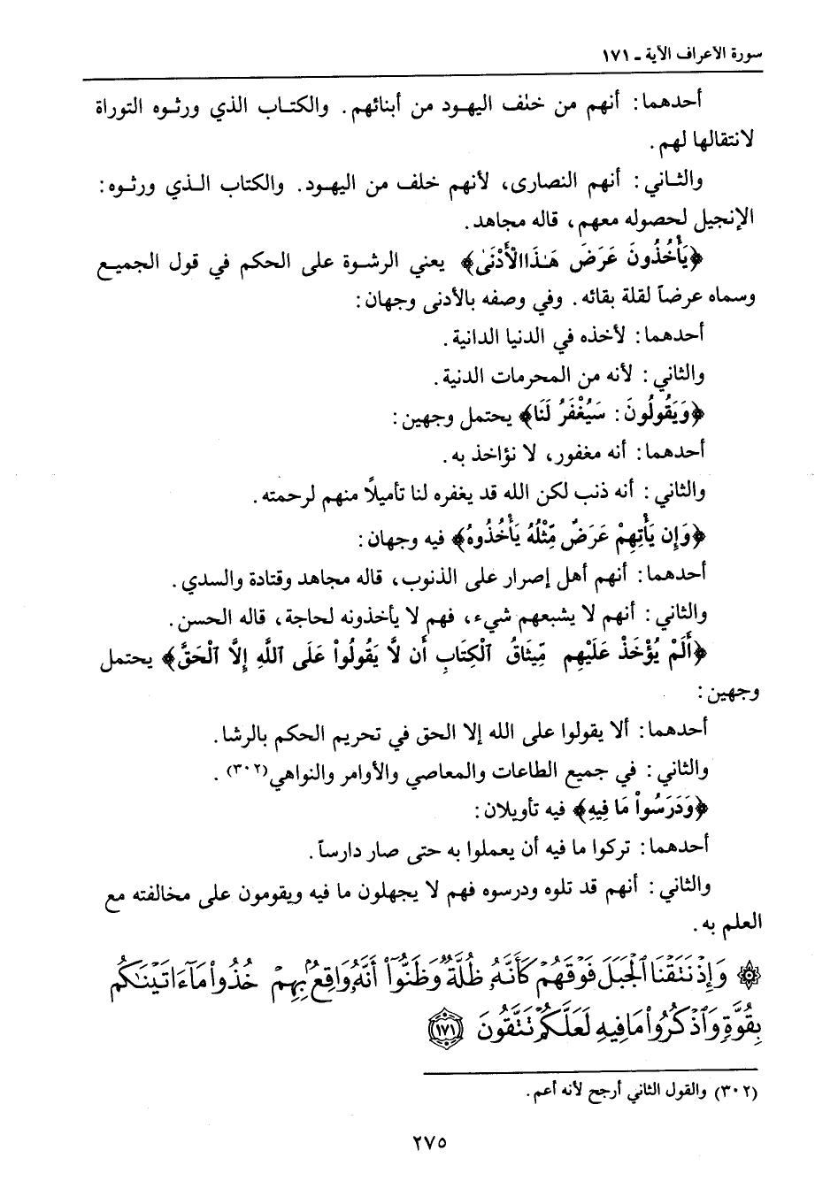 أحدهما: أنهم من خلف اليهود من أبنائهم. والكتاب الذي ورثوه التوراة لانتقالها لهم. والثاني: أنهم النصارى: لأنهم خلف من اليهود. والكتاب الذي ورثوه: الإنجيل لحصوله معهم , قاله مجاهد. {يَأْخُذُونَ عَرَضَ هَذَا الأَدْنَى} يعني الرشوة على الحكم في قول الجميع وسماه عرضاً لقلة بقائه. وفي وصفه بالأدنى وجهان: أحدهما: لأخذه في الدنيا الدانية. والثاني: لأنه من المحرمات الدنية. {وَيَقُولُونَ: سَيُغْفرُ لَنَا} يحتمل وجهين: أحدهما: أنه مغفور , لا نؤاخذ به. والثاني: أنه ذنب لكن الله قد يغفره لنا تأميلاً منهم لرحمته. {وَإِن يَأْتِهِمْ عَرَضٌ مِّثْلُهُ يَأْخُذُوهُ} فيه وجهان: أحدهما: أنهم أهل إصرار على الذنوب , قاله مجاهد وقتادة والسدي. والثاني: أنهم لا يشبعهم شيء , فهم لا يأخذونه لحاجة , قاله الحسن. {أَلَمْ يُؤْخَذْ عَلَيْهِم مِّيثَاقُ الْكِتَابِ أَن لاَّ يَقُولُواْ عَلَى اللَّهِ إِلاَّ الْحَقَّ} يحتمل وجهين: أحدهما: ألا يقولوا على الله إلا الحق في تحريم الحكم بالرشا. والثاني: في جميع الطاعات والمعاصي والأوامر والنواهي. {وَدَرَسُواْ مَا فِيهِ} فيه تأويلان: أحدهما: تركوا ما فيه أن يعملوا به حتى صار دارساً. والثاني: أنهم قد تلوه ودرسوه فهم لا يجهلون ما فيه ويقومون على مخالفته مع العلم به.