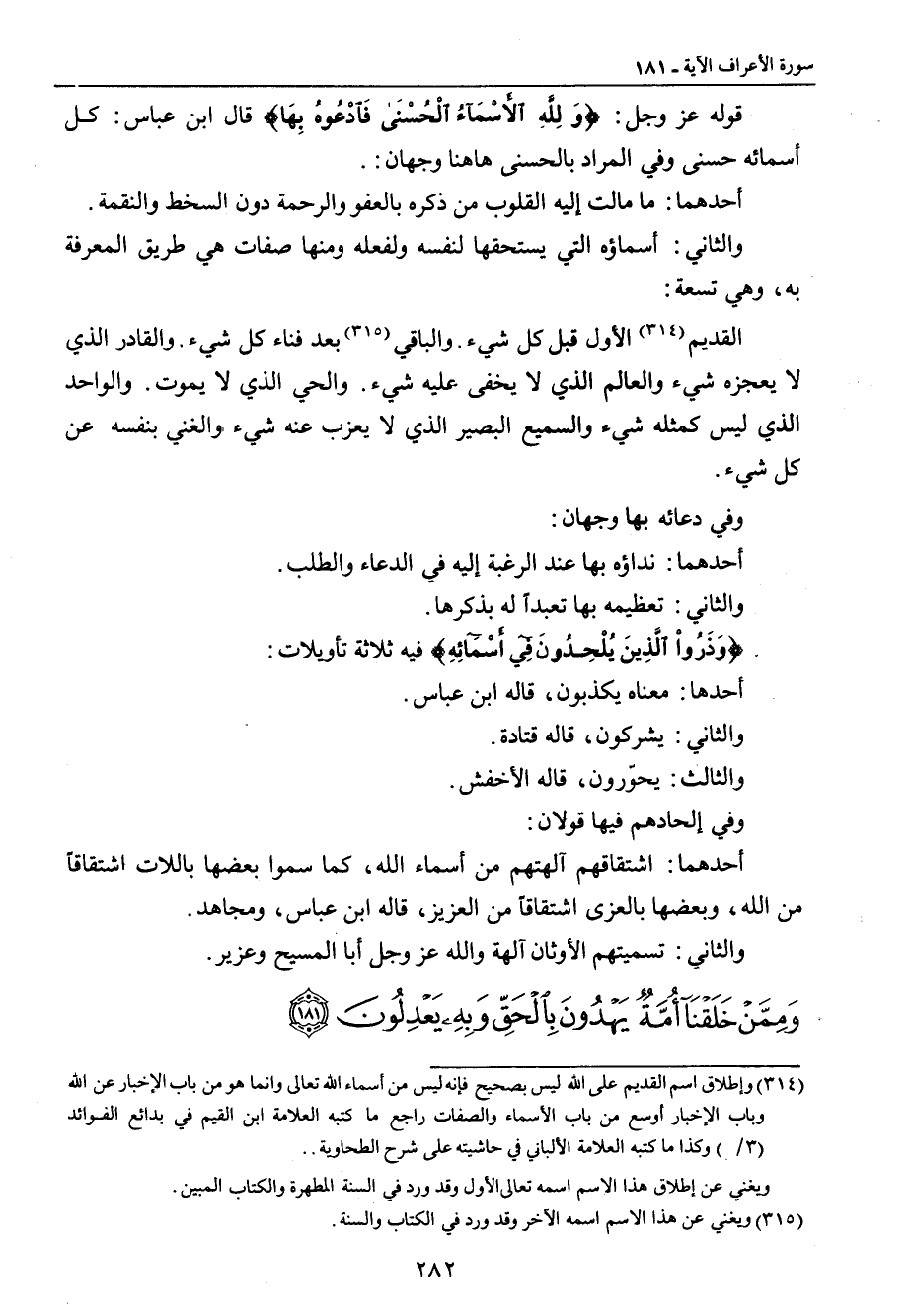 قوله عز وجل: {وَلِلَّهِ الأَسْمآءُ الْحُسْنَى فَادْعُوهُ بِهَا} قال ابن عباس: كل أسمائه حسنى وفي المراد بالحسنى ها هنا وجهان: أحدهما: ما مالت إليه القلوب من ذكره بالعفو والرحمة دون السخط والنقمة. والثاني: أسماؤه التي يستحقها لنفسه ولفعله ومنها صفات هي طريقة المعرفة به , وهي تسعة: القديم الأول قبل كل شيء. والباقي بعد فناء كل شيء. والقادر الذي لا يعجزه شيء والعالم الذي لا يخفى عليه شيء. والحي الذي لا يموت. والواحد الذي ليس كمثله شيء والسميع البصير الذي لا يعزب عنه شيء والغني بنفسه عن كل شيء. وفي دعائه بها وجهان: أحدهما: نداؤه بها عند الرغبة إليه في الدعاء والطلب. والثاني: تعظيمه بها تعبداً له بذكرها. {وَذَرُواْ الَّذِينَ يُلْحِدُونَ فِي أَسْمَآئِهِ} فيه ثلاثة تأويلات: أحدها: معناه يكذبون , قاله ابن عباس. والثاني: يشركون , قاله قتادة. والثالث: يحوّرون , قاله الأخفش. وفي إلحادهم فيها قولان: أحدهما: اشتقاقهم آلهتهم من أسماء الله , كما سموا بعضها باللات اشتقاقاً من الله , وبعضها بالعزى اشتقاقاً من العزيز , قاله ابن عباس , ومجاهد. والثاني: تسميتهم الأوثان آلهة والله عز وجل أبا المسيح وعزير.