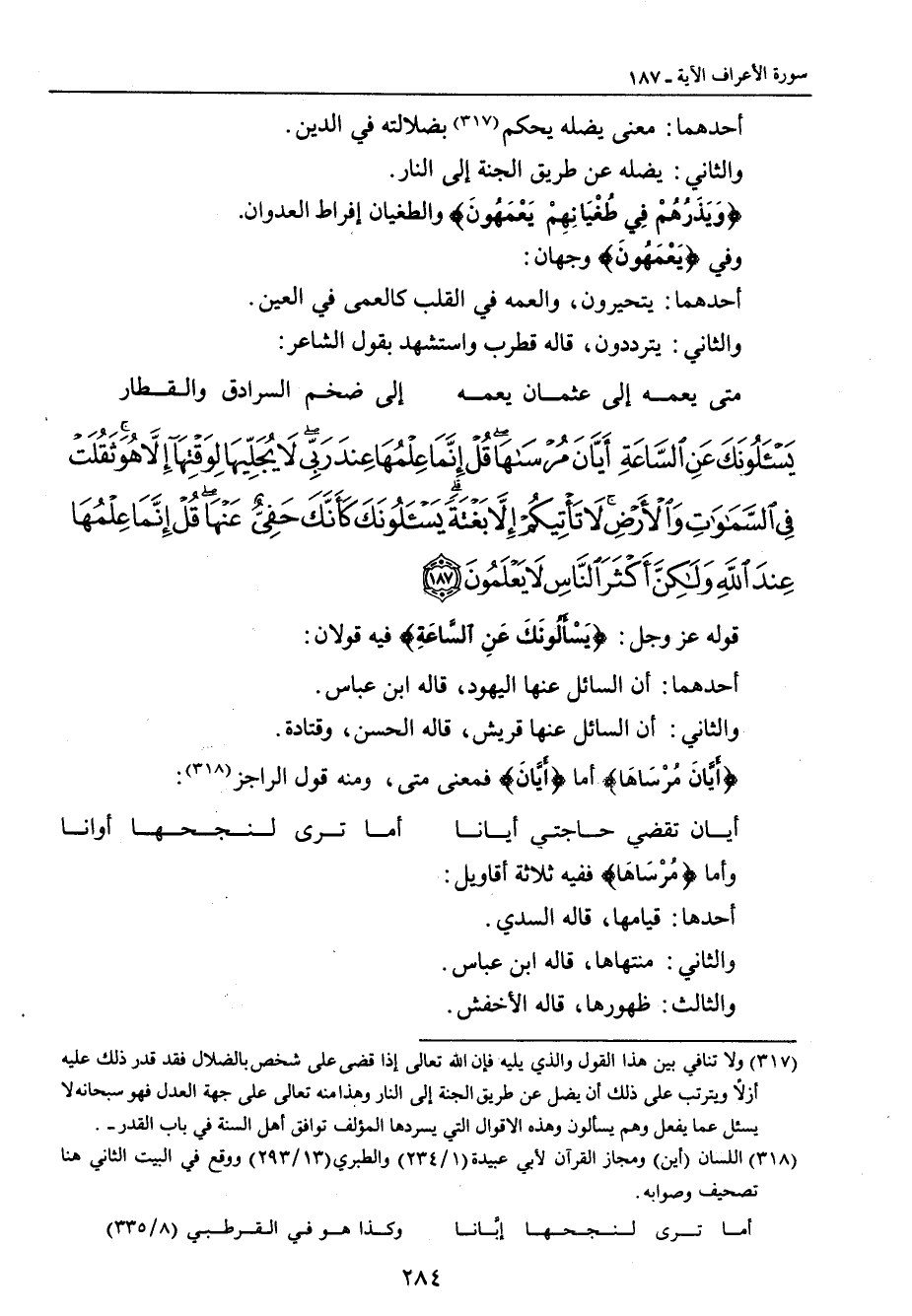 {يسألونك عن الساعة أيان مرساها قل إنما علمها عند ربي لا يجليها لوقتها إلا هو ثقلت في السماوات والأرض لا تأتيكم إلا بغتة يسألونك كأنك حفي عنها قل إنما علمها عند الله ولكن أكثر الناس لا يعلمون} قوله عز وجل: {يَسْأَلُونَكَ عَنِ السَّاعَةِ} فيه قولان: أحدهما: أن السائل عنها اليهود , قاله ابن عباس. والثاني: أن السائل عنها قريش , قاله الحسن , وقتادة. {أَيَّانَ مُرْسَاهَا} أما {أَيَّانَ} فمعنى متى , ومنه قول الراجز: