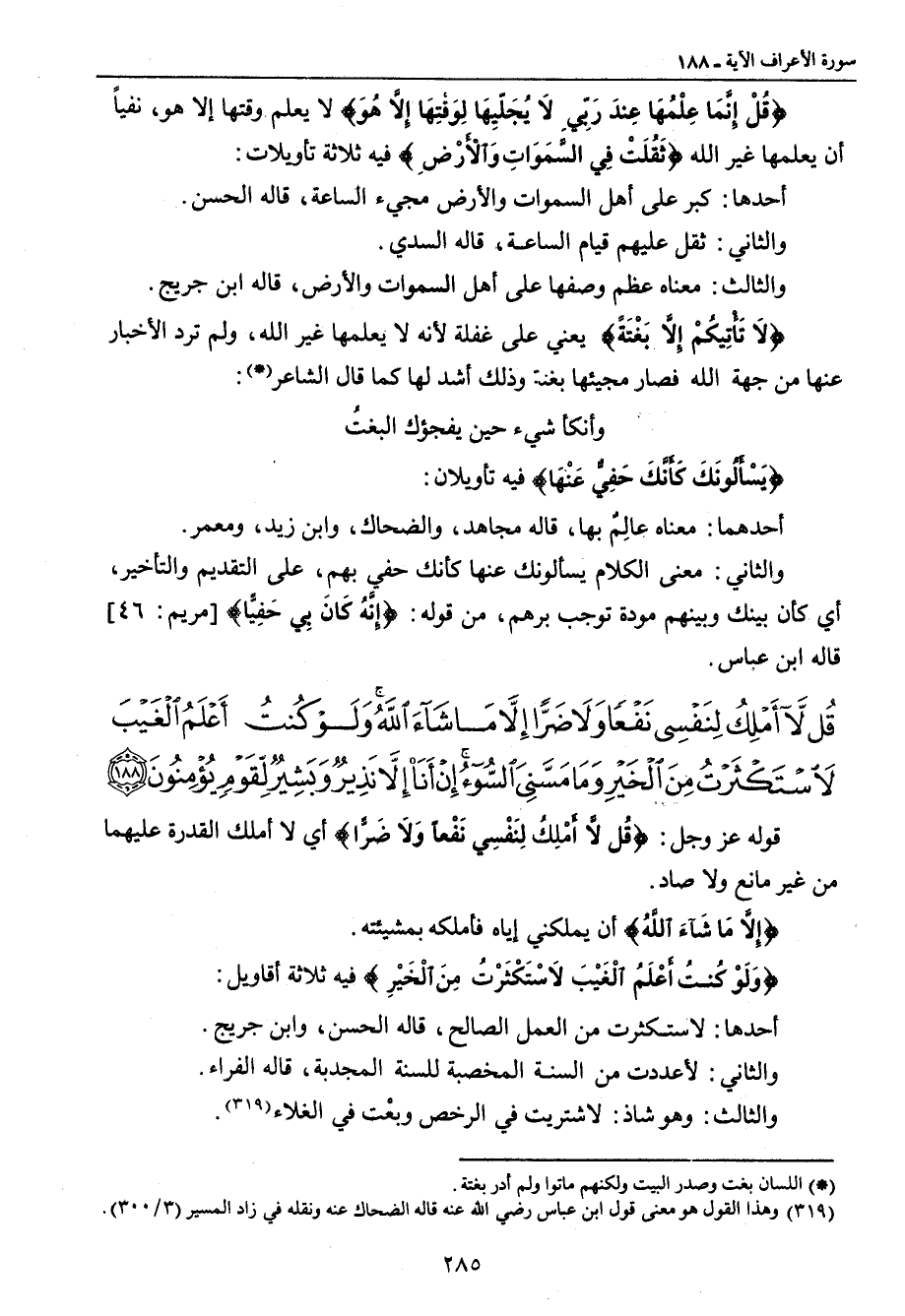 {قُلْ إِنَّمَا عِلْمُهَا عِندَ رَبِّيِ لاَ يُجَلِّيهَا لِوَقْتِهَا إِلاَّ هُوَ} لا يعلم وقتها إلا هو , نفياً أن يعلمها غير الله {ثَقُلَتْ فِي السَّمَوَاتِ وَالأَرْضِ} فيه ثلاثة تأويلات: أحدها: كبر على أهل السموات والأرض مجيء الساعة , قاله الحسن. والثاني: ثقل عليهم قيام الساعة , قاله السدي. والثالث: معناه عظم وصفها على أهل السموات والأرض , قاله ابن جريج. {لاَ تَأْتِيكُمْ إِلاَّ بَغْتَةً} يعني على غفلة لأنه لا يعلمها غير الله , ولم ترد الأخبار عنها من جهة الله فصار مجيئها بغتة وذلك أشد لها كما قال الشاعر:
