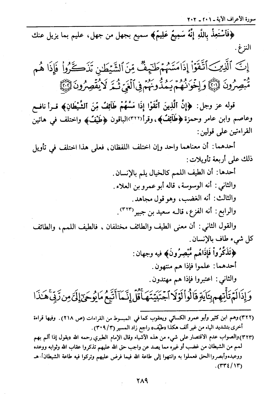 {إن الذين اتقوا إذا مسهم طائف من الشيطان تذكروا فإذا هم مبصرون وإخوانهم يمدونهم في الغي ثم لا يقصرون} قوله عز وجل: {إِنَّ الَّذِينَ اتَّقوْا إِذَا مَسَّهُمْ طَآئِفٌ مِّنَ الشَّيْطَانِ} قرأ نافع وعاصم وابن عامر وحمزة {طَآئِفٌ} , وقرأ الباقون {طَيْفٌ} واختلف في هاتين القراءتين على قولين: أحدهما: أن معناهما واحد وإن اختلف اللفظان , فعلى هذا اختلف في تأويل ذلك على أربعة تأويلات: أحدها: أن الطيف اللمم كالخيال يلم بالإنسان. والثاني: أنه الوسوسة , قاله أبو عمرو بن العلاء. والثالث: أنه الغضب , وهو قول مجاهد. والرابع , أنه الفزع , قاله سعيد بن جبير. والقول الثاني: أن معنى الطيف والطائف مختلفان , فالطيف اللمم , والطائف كل شيء طاف بالإنسان. {تَذَكَّرُواْ فَإِذَا هُمْ مُّبْصِرُونَ} فيه وجهان: أحدهما: علموا فإذا هم منتهون. والثاني: اعتبروا فإذا هم مهتدون.