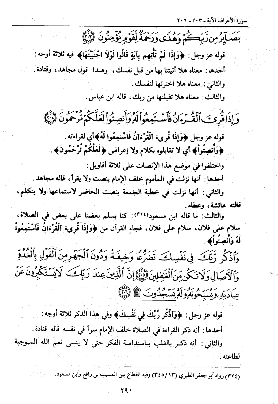 {وإذا قرئ القرآن فاستمعوا له وأنصتوا لعلكم ترحمون} قوله عز وجل {وَإِذَا قُرِىءَ الْقُرْءَآنُ فِاسْتَمِعُوا لَهُ} أي لقراءته. {وَأَنصِتُواْ} أي لا تقابلوه بكلام ولا إعراض {لَعَلَّكُمْ تُرْحَمُونَ}. واختلفوا في موضع هذا الإنصات على ثلاثة أقاويل: أحدها: أنها نزلت في المأموم خلف الإمام ينصت ولا يقرأ , قاله مجاهد. والثاني: أنها نزلت في خطبة الجمعة ينصت الحاضر لاستماعها ولا يتكلم , قالته عائشة , وعطاء. والثالث: ما قاله ابن مسعود: كنا يسلم بعضنا على بعض في الصلاة , سلام على فلان , سلام على فلان , فجاء القرآن من {وَإِذَا قُرِىءَ الْقُرءَانُ فَاسْتَمِعُواْ لَهُ وَأَنصِتُواْ}.