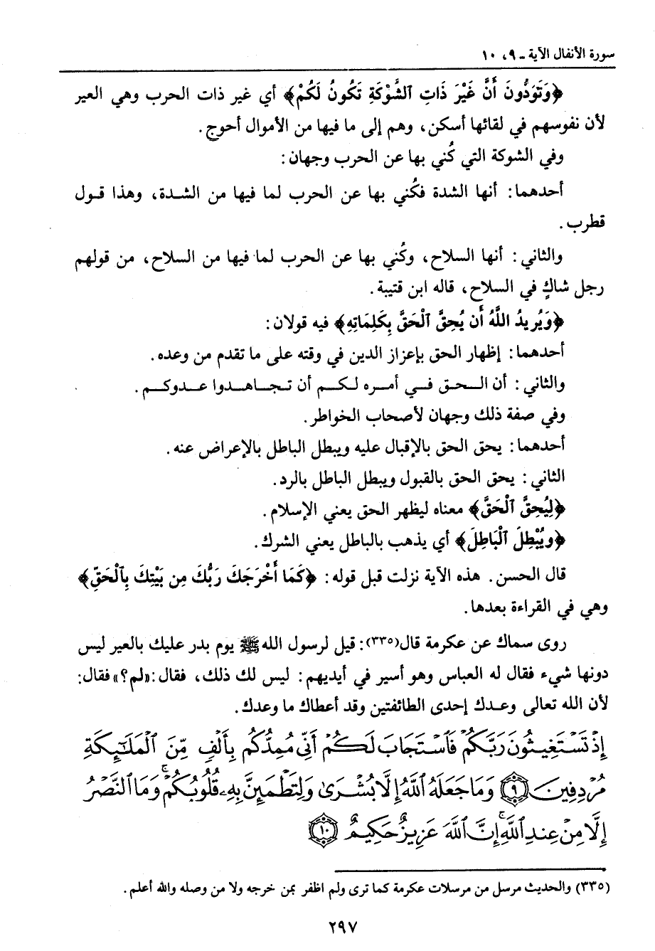 {وَتَوَدُّونَ أَنَّ غَيْرَ ذَاتِ الشَّوْكَةِ تَكُونُ لَكُمْ} أي غير ذات الحرب وهي العير لأن نفوسهم في لقائها أسكن , وهم إلى ما فيها من الأموال أحوج. وفي الشوكة التي كُني بها عن الحرب وجهان: أحدهما: أنها الشدة فكُني بها عن الحرب لما فيها من الشدة , وهذا قول قطرب. والثاني: أنها السلاح , وكُني بها عن الحرب لما فيها من السلاح , من قولهم رجل شاكٍ في السلاح , قاله ابن قتيبة. {وَيُريدُ اللَّهُ أَن يُحِقَّ الْحَقَّ بِكَلِمَاتِهِ} فيه قولان: أحدهما: إظهار الحق بإعزاز الدين في وقته على ما تقدم من وعده. والثاني: أن الحق في أمره لكم أن تجاهدوا عدوكم. وفي صفة ذلك وجهان لأصحاب الخواطر. أحدهما: يحق الحق بالإقبال عليه ويبطل الباطل بالإعراض عنه. الثاني: يحق الحق بالقبول ويبطل الباطل بالرد. {لِيُحِقَّ الْحَقَّ} معناه ليظهر الحق يعني الإسلام. {ويُبْطِلَ الْبَاطِلَ} أي يذهب بالباطل يعني الشرك. قال الحسن. هذه الآية نزلت قبل قوله: {كَمَا أَخْرَجَكَ رَبُّكَ مِن بَيْتِكَ بِالْحَقِّ} وهي في القراءة بعدها. روى سماك عن عكرمة قال: قيل لرسول الله صلى الله عليه وسلم يوم بدر عليك بالعير ليس دونها شيء فقال له العباس وهو أسير في أيديهم: ليس لك ذلك , فقال: (لم؟) فقال: لأن الله تعالى وعدك إحدى الطائفتين وقد أعطاك ما وعدك.
