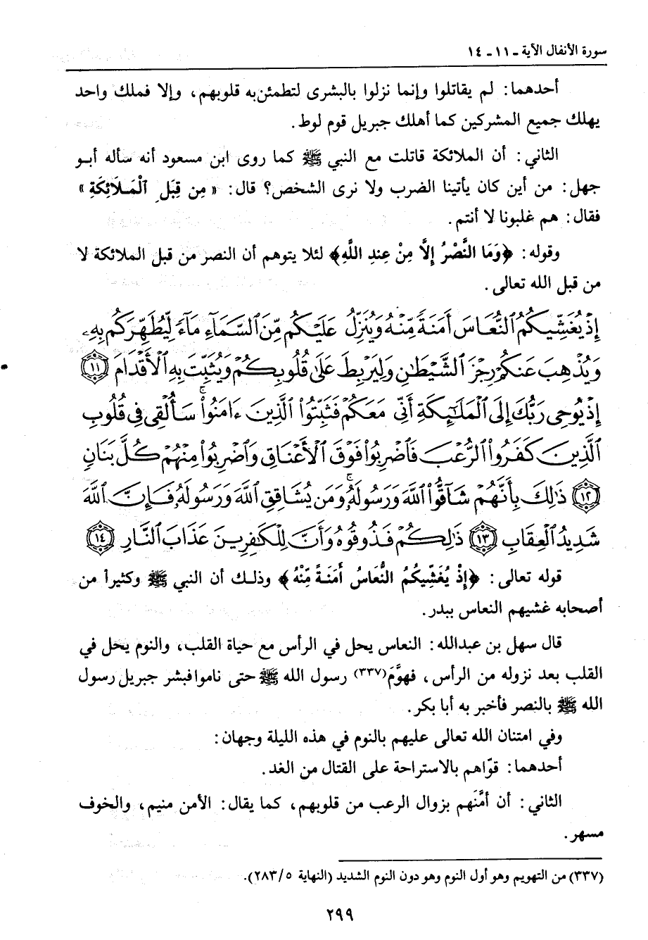 {إذ يغشيكم النعاس أمنة منه وينزل عليكم من السماء ماء ليطهركم به ويذهب عنكم رجز الشيطان وليربط على قلوبكم ويثبت به الأقدام إذ يوحي ربك إلى الملائكة أني معكم فثبتوا الذين آمنوا سألقي في قلوب الذين كفروا الرعب فاضربوا فوق الأعناق واضربوا منهم كل بنان ذلك بأنهم شاقوا الله ورسوله ومن يشاقق الله ورسوله فإن الله شديد العقاب ذلكم فذوقوه وأن للكافرين عذاب النار} قوله تعالى: {إِذْ يُغَشِّيكُمُ النُّعَاسُ أَمَنَةً مِّنْهُ} وذلك أن النبي صلى الله عليه وسلم وكثيراً من أصحابه غشيهم النعاس ببدر. قال سهل بن عبد الله: النعاس يحل في الرأس مع حياة القلب , والنوم يحل في القلب بعد نزول من الرأس , فهوَّمَ رسول الله صلى الله عليه وسلم حتى ناموا فبشر جبريل رسول الله صلى الله عليه وسلم بالنصر فأخبر به أبا بكر. وفي امتنان الله تعالى عليهم بالنوم في هذه الليلة وجهان: أحدهما: قوّاهم بالاستراحة على القتال من الغد. الثاني: أن أمَّنَهم بزوال الرعب من قلوبهم , كما قال: الأمن منيم , والخوف مسهر.