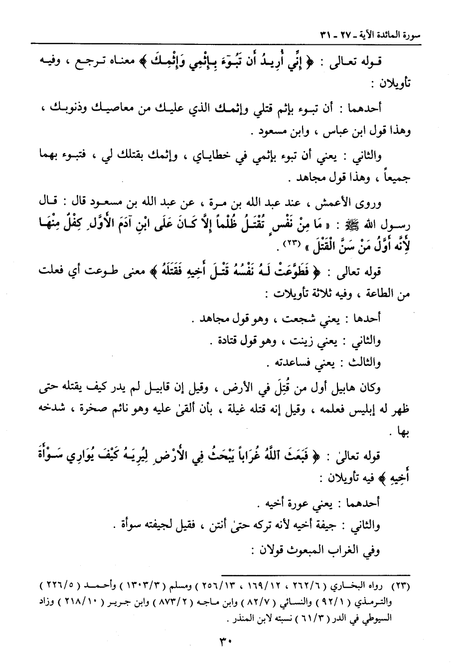قوله تعالى: {إِنِّي أُرِيدُ أَن تَبُوءَ بِإِثْمِي وَإِثْمِكَ} معناه ترجع , وفيه تأويلان: إحدهما: أن تبوء بإثم قتلي وإثمك الذي عليك من معاصيك وذنوبك , وهذا قول ابن عباس , وابن مسعود. والثاني: يعني أن تبوء بإثمي فى خطاياي , وإثمك بقتلك لي , فتبوء بهما جميعاً , وهذا قول مجاهد. وروى الأعمش , عند عبد الله بن مرة , عن عبد الله بن مسعود قال: قال رسول الله صلى الله عليه وسلم: (مَا مِنْ نَفْسٍ تُقتَلُ ظُلْماً إِلاَّ كَانَ عَلَى ابْنِ آدَمَ الأَوَّلِ كِفْلٌ مِنْهَا لأَنَّهُ أَوَّلُ مَنْ سَنَّ الْقَتْلَ). قوله تعالى: {فَطَوَّعَتْ لَهُ نَفْسُهُ قَتْلَ أَخِيهِ فَقَتَلَهُ} معنى طوعت أي فعلت من الطاعة , وفيه ثلاثة تأويلات: أحدها: يعنى شجعت , وهو قول مجاهد. والثاني: يعني زينت , وهو قول قتادة. والثالث: يعني فساعدته. وكان هابيل أول من قُتِلَ في الأرض , وقيل إن قابيل لم يدر كيف يقتله حتى ظهر له إبليس فعلمه , وقيل إنه قتله غيلة , بأن ألقى عليه وهو نائم صخرة , شدخه بها. قوله تعالى: {فَبَعَثَ اللَّهُ غُرَاباً يَبْحَثُ فِي الأرْضِ لِيُرِيَهُ كَيْفَ يُوَارِي سَوْأَةَ أَخِيهِ} فيه تأويلان: أحدهما: يعني عورة أخيه. والثاني: جيفة أخيه لأنه تركه حتى أنتن , فقيل لجيفته سوأة. وفي الغراب المبعوث قولان: