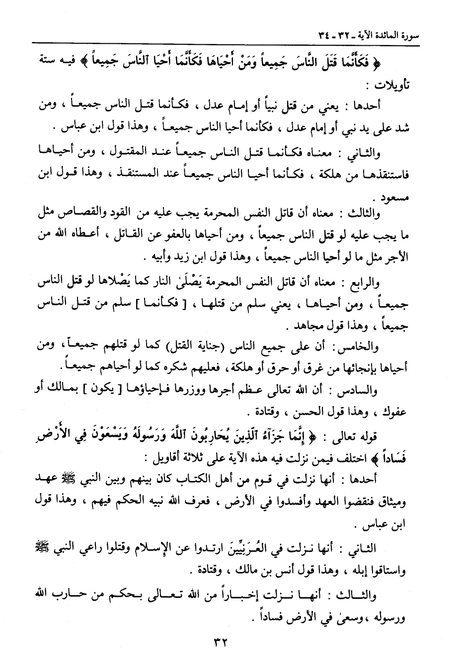 {فَكَأَنَّمَ قَتَلَ النَّاسَ جَمِيعاً وَمَنْ أَحْيَاهَا فَكَأَنَّمَا أَحْيَا النَّاسَ جَمِيعاً} فيه ستة تأويلات: أحدها: يعني من قتل نبياً أو إمام عدل , فكأنما قتل الناس جميعاً , ومن شد على يد نبى أو إمام عدل , فكأنما أحيا الناس جميعاً , وهذا قول ابن عباس. والثاني: معناه فكأنما قتل الناس جميعاً عند المقتول , ومن أحياها فاستنفذها من هلكة , فكأنما أحيا الناس جميعاً عند المستنفذ , وهذا قول ابن مسعود. والثالث: معناه أن قاتل النفس المحرمة يجب عليه من القود والقصاص مثل ما يجب عليه لو قتل الناس جميعاً , ومن أحياها بالعفو عن القاتل , أعطاه الله من الأجر مثل ما لو أحيا الناس جميعاً , وهذا قول ابن زيد وأبيه. والرابع: معناه أن قاتل النفس المحرمة يَصْلَى النار كما يَصْلاها لو قتل الناس جيمعاً , ومن أحياها , يعني سلم من قتلها , [فكأنما] سلم من قتل الناس جميعاً , وهذا قول مجاهد. والخامس: أن على جميع الناس (جناية القتل) كما لو قتلهم جميعاً , ومن أحياها بإنجائها من غرق أو حرق أو هلكة , فعليهم شكره كما لو أحياهم جميعاً. والسادس: أن الله تعالى عظم أجرها ووزرها فإحياؤها [يكون] بمالك أو عفوك , وهذا قول الحسن , وقتادة. قوله تعالى: {إِنَّمَا جَزَآءُ الَّذِينَ يُحَارِبُونَ اللَّهَ وَرَسُولَهُ وَيَسْعَوْنَ فِي الأرْضِ فَسَاداً} اختلف فيمن نزلت فيه هذه الآية على ثلاثة أقاويل: أحدها: أنها نزلت فى قوم من أهل الكتاب كان بينهم وبين النبي صلى الله عليه وسلم عهد وميثاق فنقضوا العهد وأفسدوا في الأرض , فعرف الله نبيه الحكم فيهم , وهذا قول ابن عباس. الثاني: أنها نزلت فى العُرَنِيِّينَ ارتدوا عن الإِسلام وقتلوا راعي النبي صلى الله عليه وسلم واستاقوا إبله , وهذا قول أنس بن مالك , وقتادة. والثالث: أنها نزلت إخباراً من الله تعالى بحكم من حارب الله ورسوله , وسعى في الأرض فساداً.